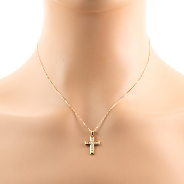 Diamond cross pendant with round Natural Diamonds totalling 0.25ct. (Estimated grading: H-I SI) 18ct yellow gold with 40cm 14ct yellow gold chain. Weight: 2.7g. (As New)