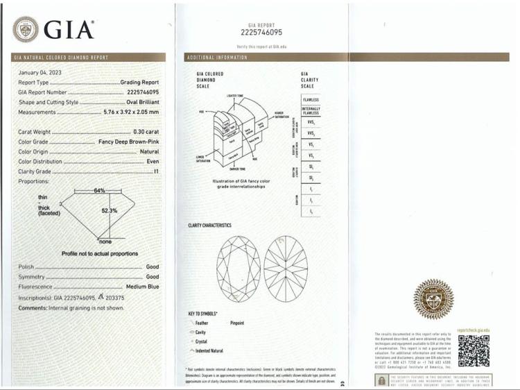 A loose oval shape Natural Argyle Diamond of 0.30ct (With copy of Argyle certificate #203375 graded as PC2 P1) and GIA report # 2225746095 graded as Natural Fancy Deep Brown-Pink, Even P1. (Pre-owned)