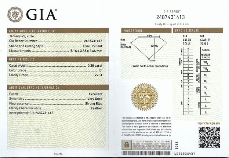 A loose oval shape Natural Diamond of 0.30ct (with GIA report graded as D VVS1 #2487431413). (New)