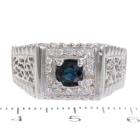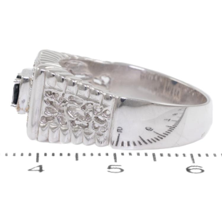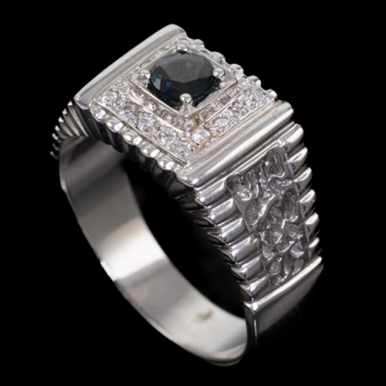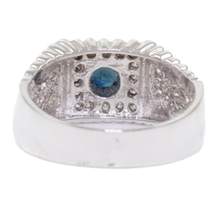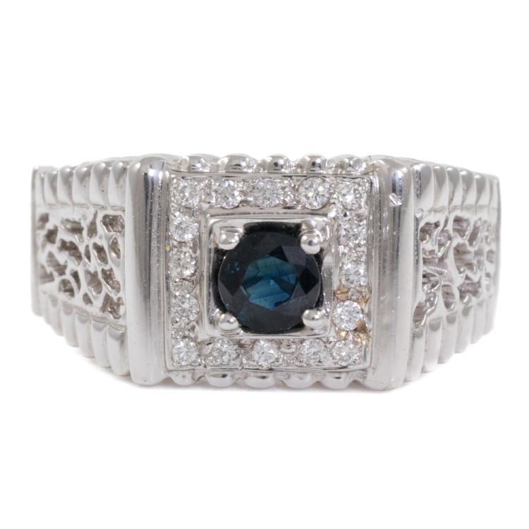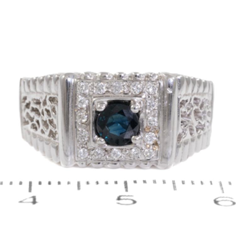 Sapphire and Diamond mens ring with round natural blue Sapphire of 0.30ct and round natural Diamonds totalling approximately 0.16ct. 18ct white gold. Ring size S. Band width: 4.7mm - 7.1mm. Weight: 8.9g (As New)