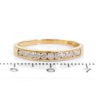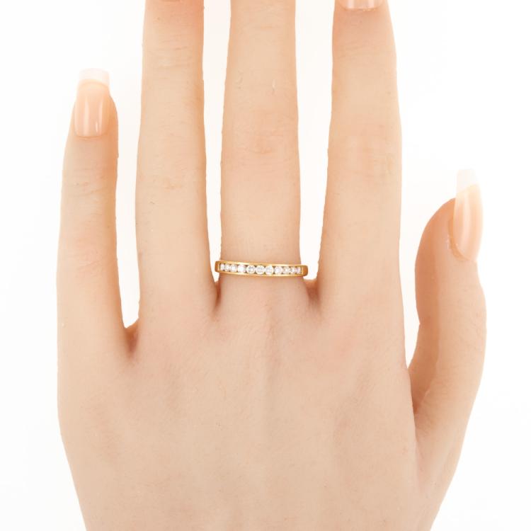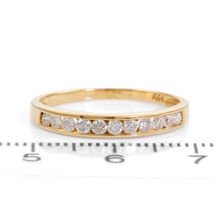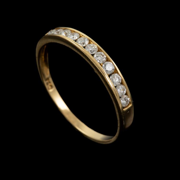 Diamond eternity ring with 11 round natural Diamonds totalling 0.33cts (Estimated grading: H-I Pique). 18ct yellow gold. Ring size O1/2. Band width: 1.6mm-2.8mm. Weight: 2.0g. With copy of GSL Valuation #AA 63603, item 9. (Pre-owned)^