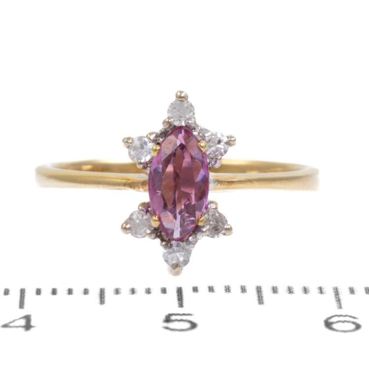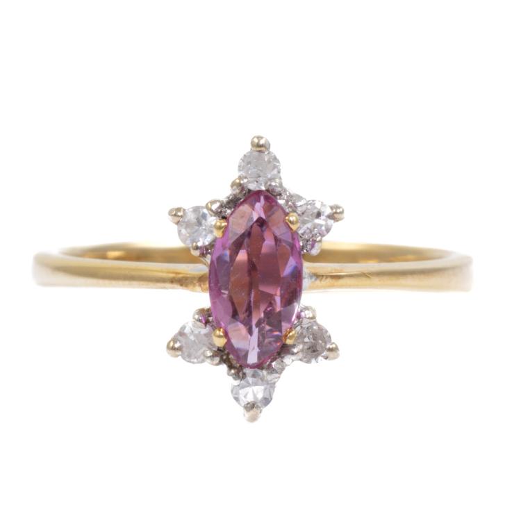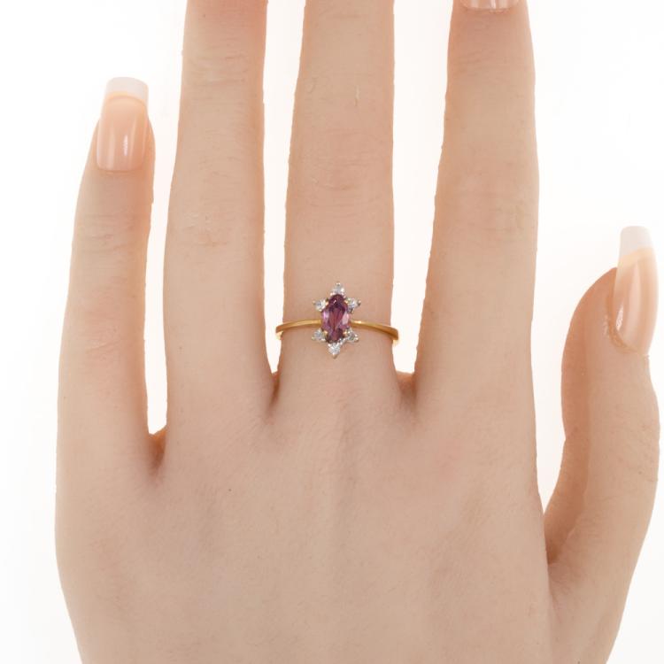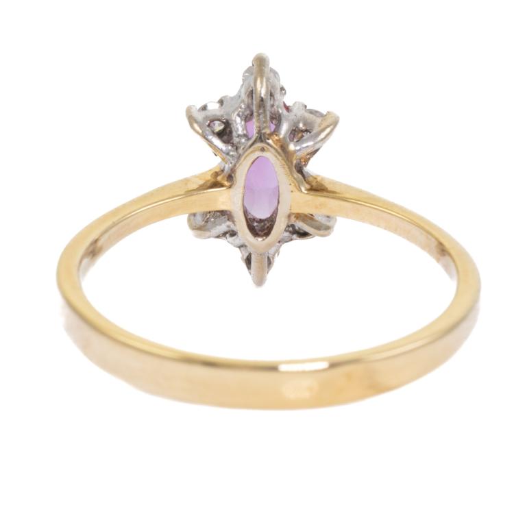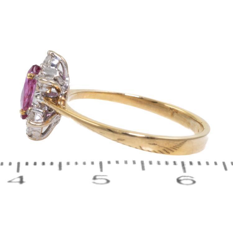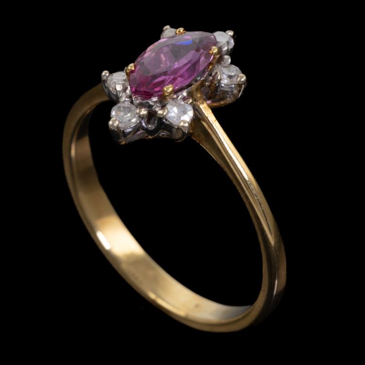 Ruby and Diamond ring with a marquise cut natural Ruby of 0.36ct and round natural Diamonds totalling 0.10ct. 18ct yellow & white gold. Ring size N. Band width: 2.4mm - 1.1mm. Weight: 2.7g. (As new)