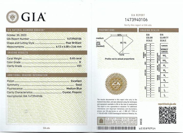 A loose pear shape Natural Diamond of 0.40ct (with GIA report graded as D VS1 #1473940106). (New)