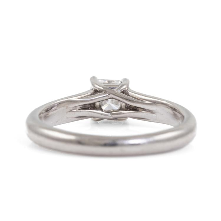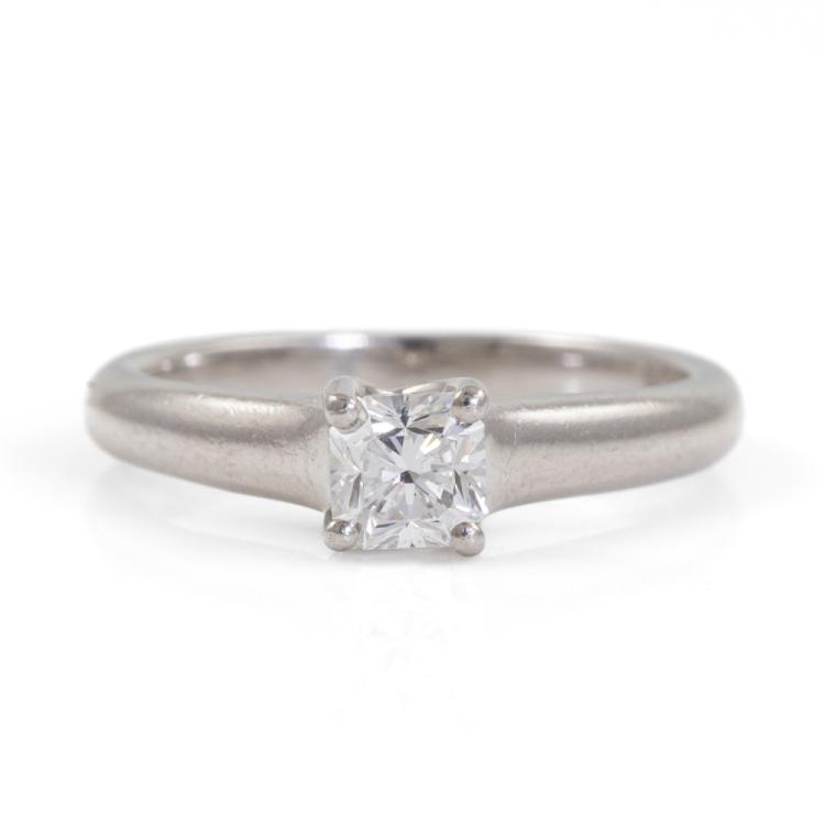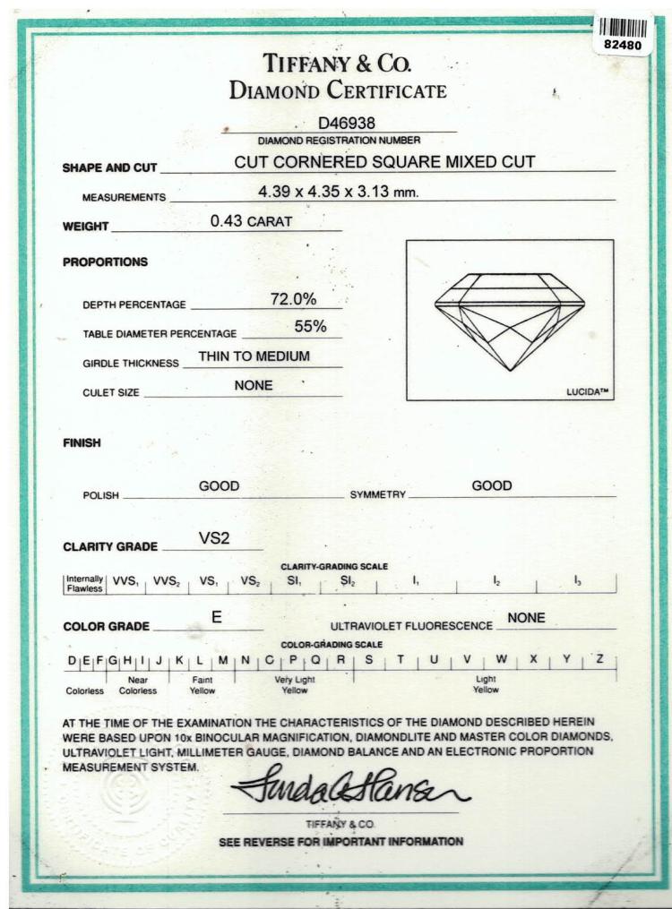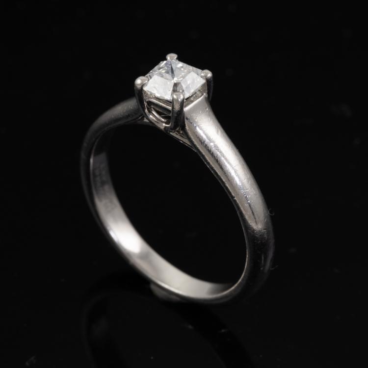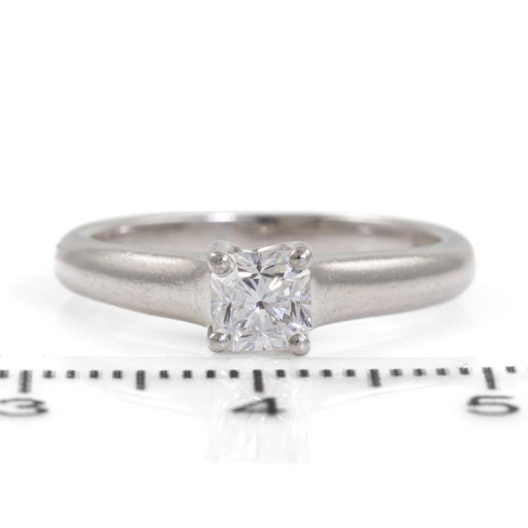 Tiffany & Co Lucida Diamond solitaire ring with a cut cornered square mixed cut Natural Diamond of 0.43ct (with Tiffany & Co Diamond Certificate graded as E VS2). Platinum 950. Ring size K - ring resizing is not recommended. Band width: 2.3mm-3.2mm. Weight: 4.6g. With Tiffany & Co box. (Pre-owned)