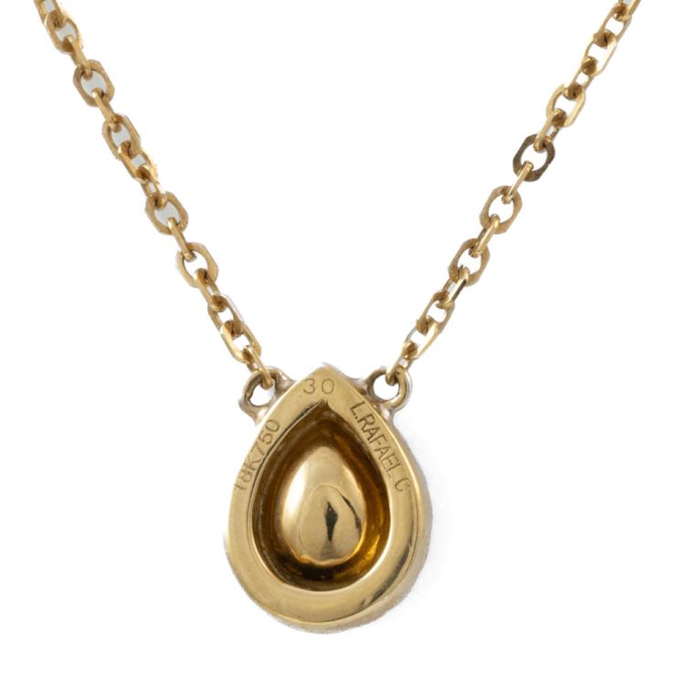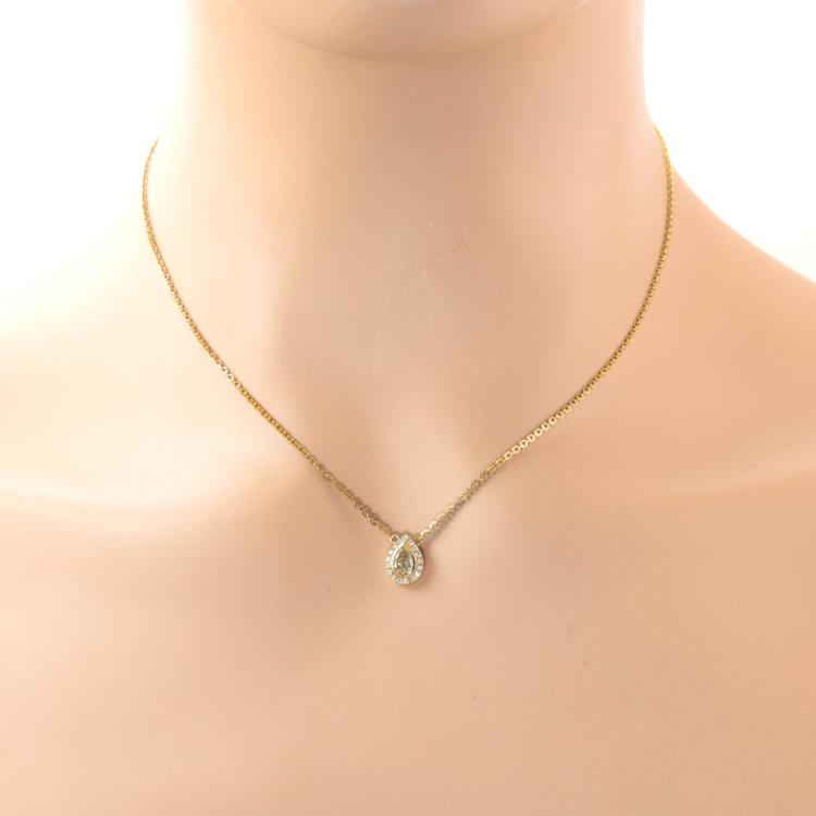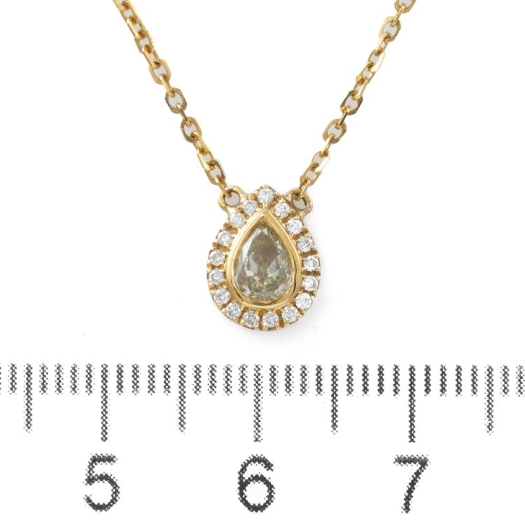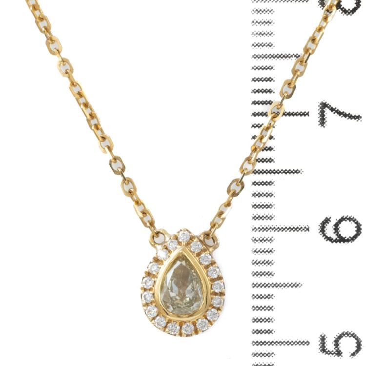 Diamond pendant with centre pear shape natural yellow Diamond of 0.44ct (Estimated grading: Fancy Yellow SI2) and round natural Diamonds totalling 0.10ct. 18ct yellow gold with 18ct yellow gold attached chain. Length: 40cm. Weight: 2.9g. (As New)