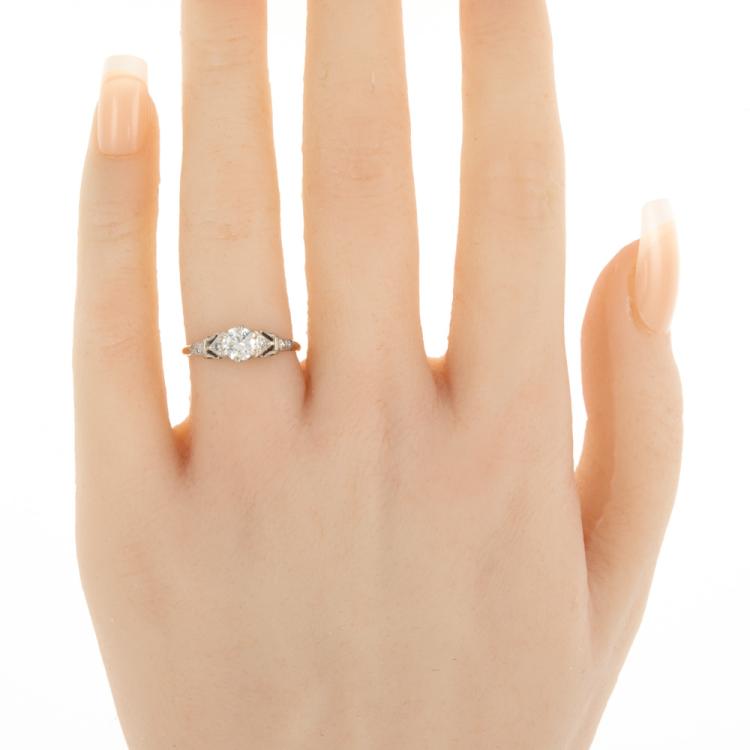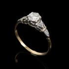 Diamond dress ring with a centre round natural Diamond of approximately 0.50ct (Estimated grading: G-H VS2) and surrounding round natural Diamonds totalling approximately 0.04cts. 18ct yellow and white gold. Ring size L. Weight: 2.1g. (Pre-owned)