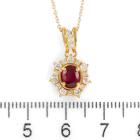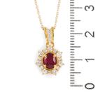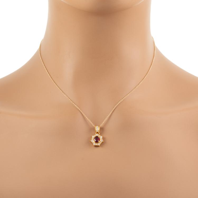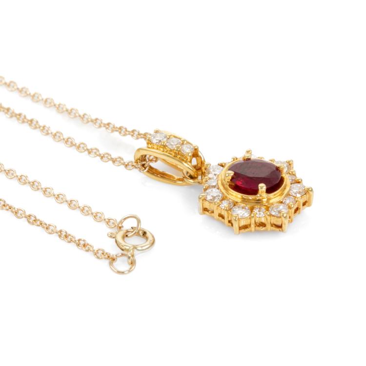 Ruby and Diamond pendant with oval shape natural Ruby of 0.52ct and round natural Diamonds totalling 0.34ct (Estimated grading: H VS-SI). 18ct yellow gold with 14ct yellow gold 40.5cm chain. Weight: 3.7g. (Pre-owned)
