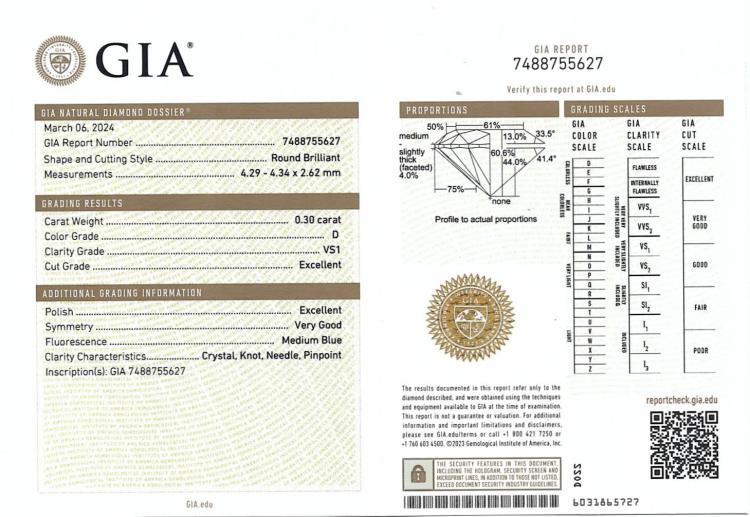 Diamond stud earrings with 2 round brilliant cut natural Diamonds totalling 0.60ct (with GIA Summary Reports graded as D VS1 #1485780668, 7488755627). 18ct white gold. Weight: 0.8g. (New)