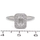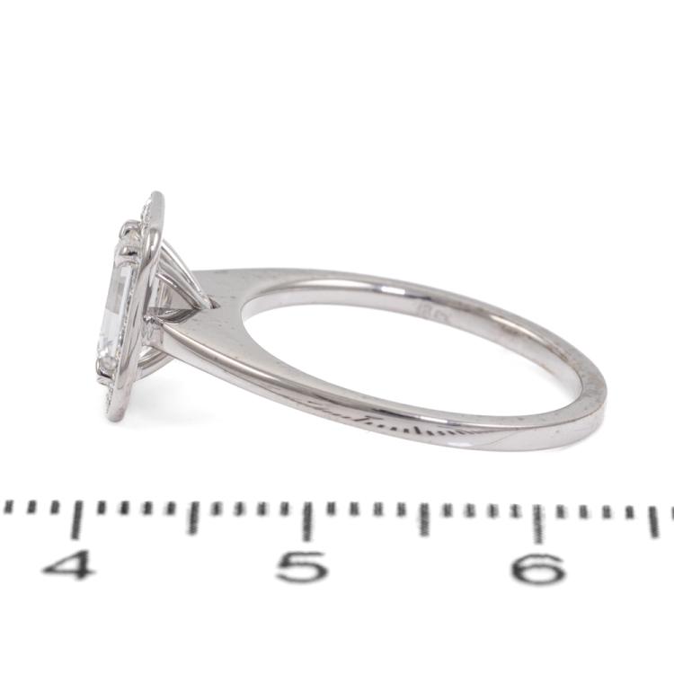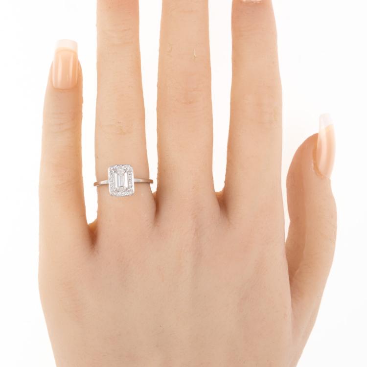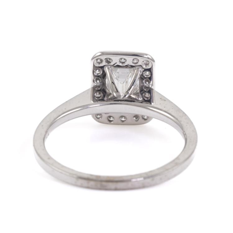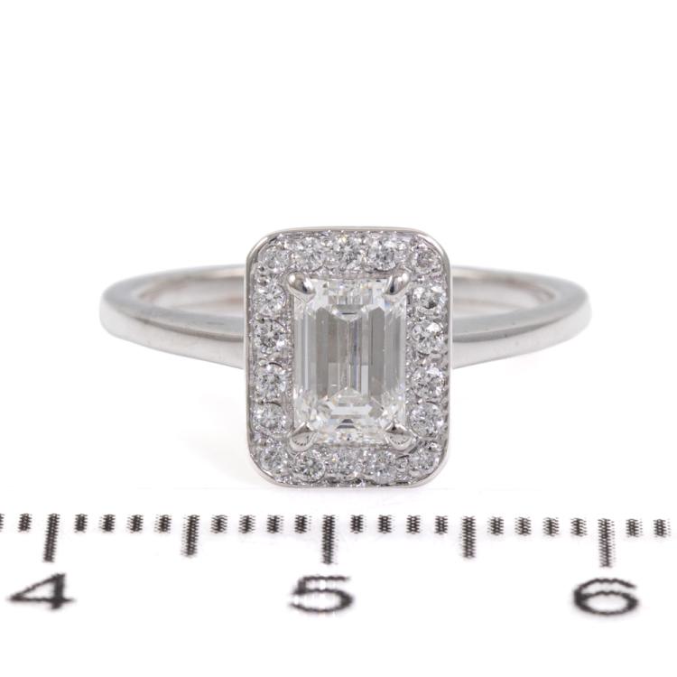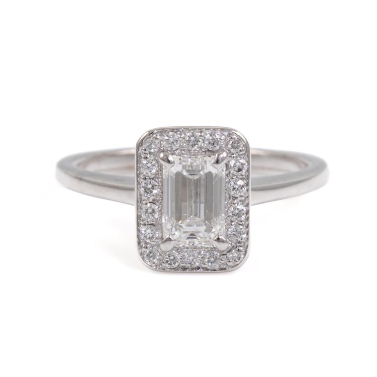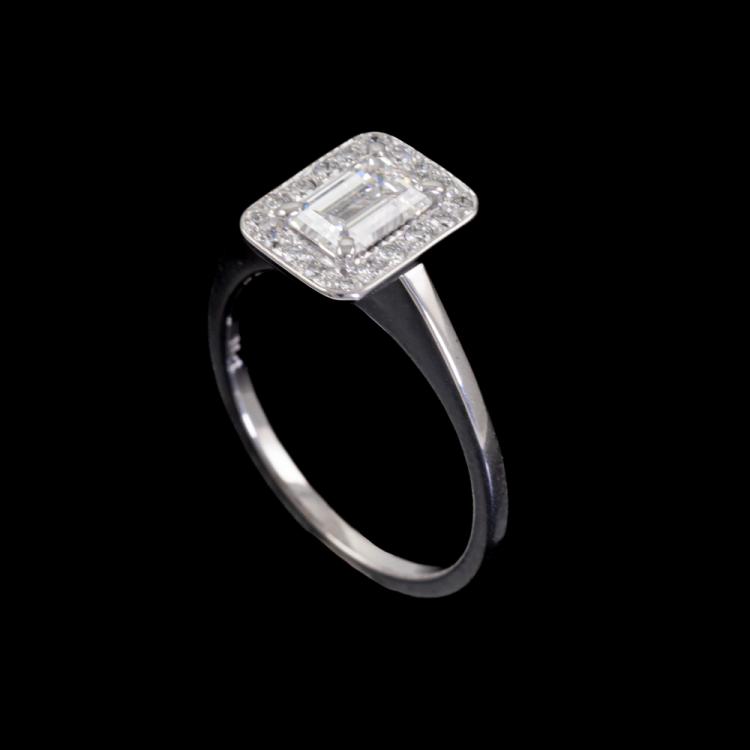 Handmade Diamond halo ring with a centre emerald cut natural Diamond of 0.70ct (with copy of GIA Diamond dossier graded as F SI1 #5266721625) and round natural Diamonds totalling approximately 0.18ct. 18ct white gold. Ring size I 1/2. Band width: 1.5mm. Weight: 3.0g. With Natalie Marie box. (Pre-owned)