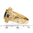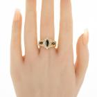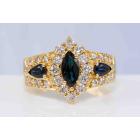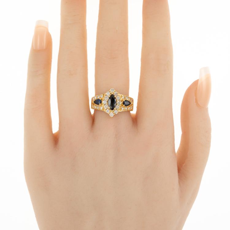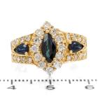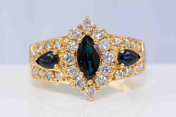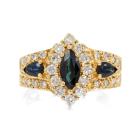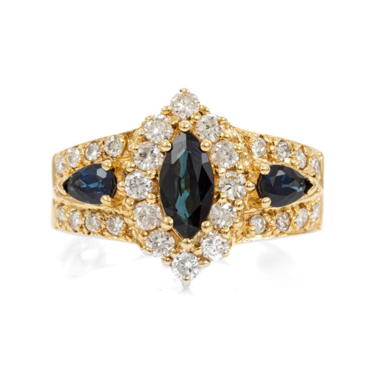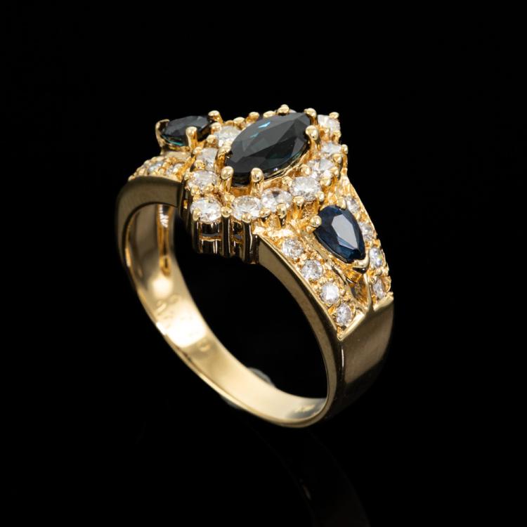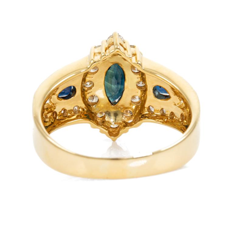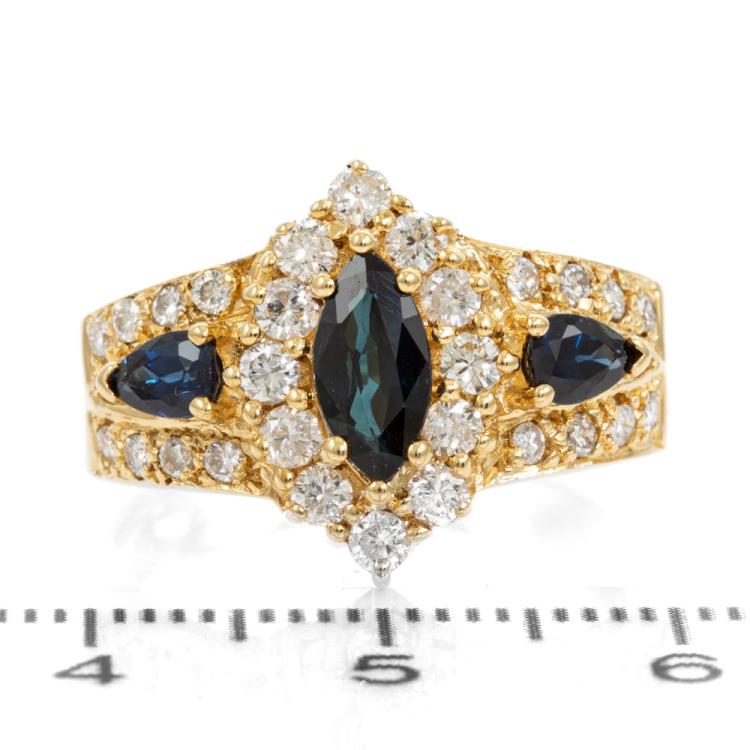 Sapphire and Diamond ring with pear & marquise cut natural blue Sapphires totalling 0.71ct and round natural Diamonds totalling 0.71ct (Estimated grading: G-H SI). 18ct yellow gold. Ring size O. Band width: 3.1 - 6.6mm. Weight: 6.5g. (Pre-owned)