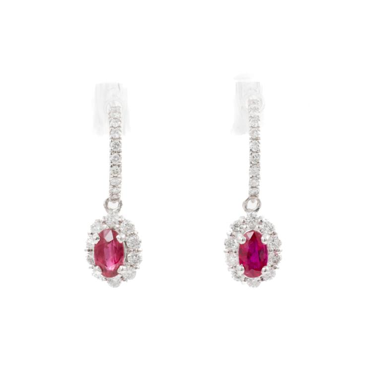 Ruby and Diamond earrings with oval shape natural Rubies totalling 0.75ct and round natural Diamonds totalling 0.46ct (Estimated grading: H SI). Platinum 900 with silicon backs. Weight: 2.6g. (Pre-owned)