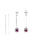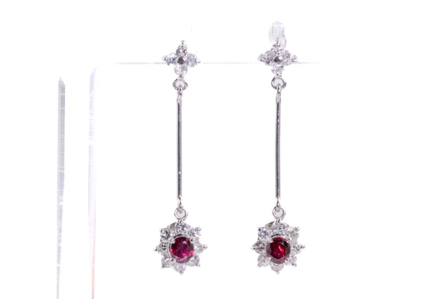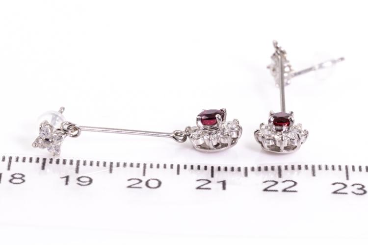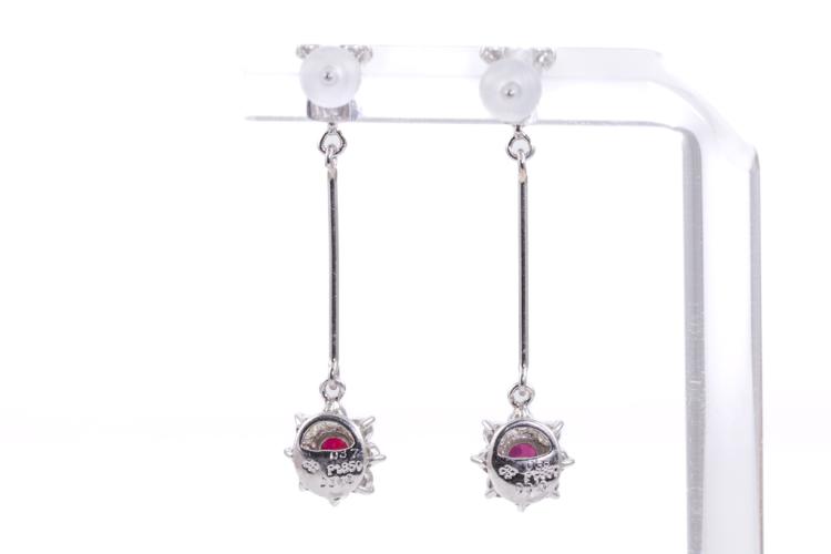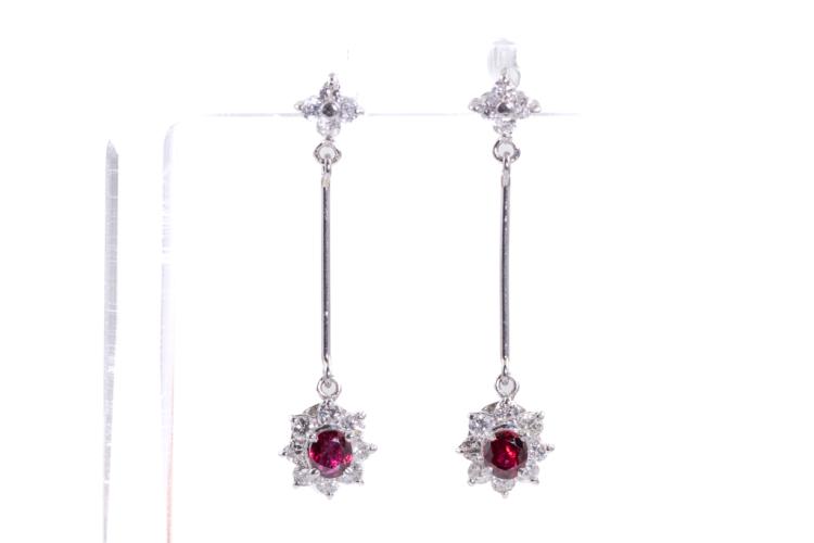 Ruby and Diamond earrings with natural Rubies (4.0mm x 3.5mm) totalling 0.75ct and natural Diamonds totalling 0.80ct (Estimated grading: G SI). Platinum 850. Item length: 35.0mm. Weight: 3.5g. (Pre-owned)