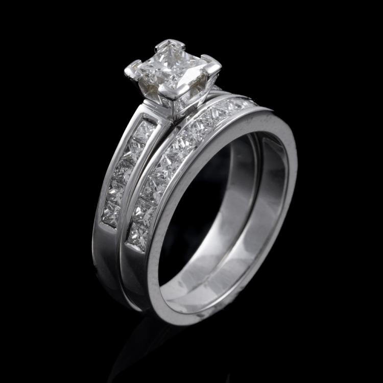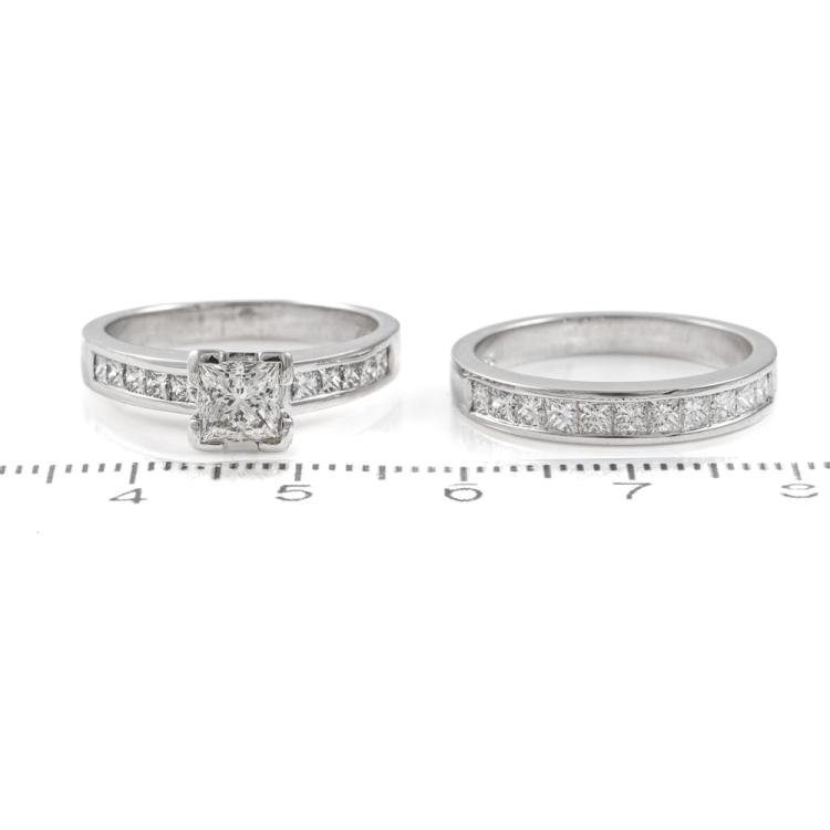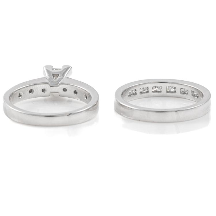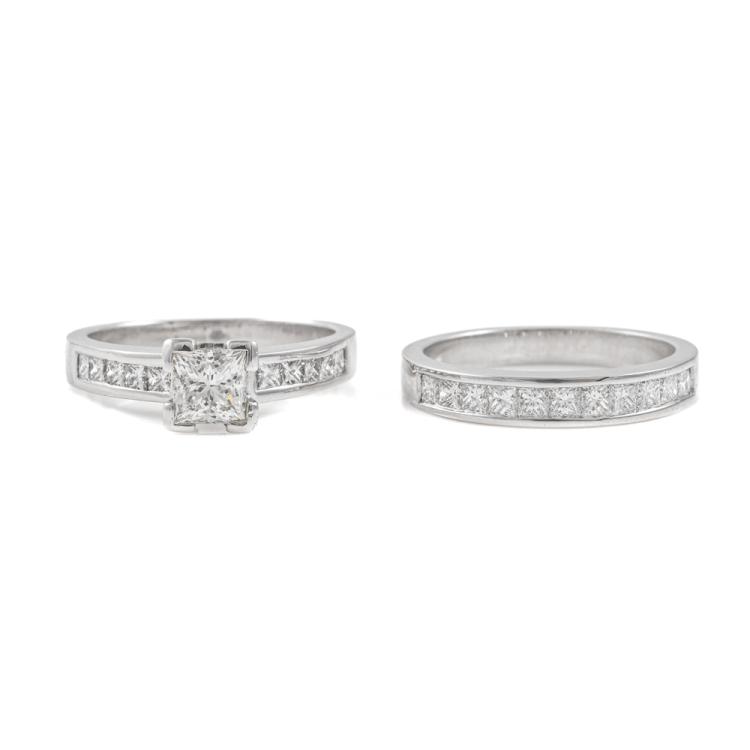 Diamond engagement ring set. Diamond solitaire ring with princess cut Natural Diamond of 0.80ct (Estimated grading: H VS) and round Natural Diamonds totalling approximately 0.40cts (Estimated grading: H SI), Ring size: N, Band width: 3.4mm - 2.8mm. And Gregory eternity ring with 11 princess cut Natural Diamonds totalling 0.44cts (Estimated grading: H SI), Ring size: N 1/4, Band width: 3.2mm - 2.7mm. Both 18ct white gold. Total weight: 10.8g. (Pre-Owned)