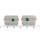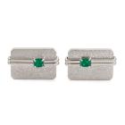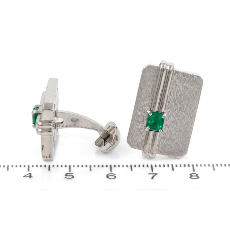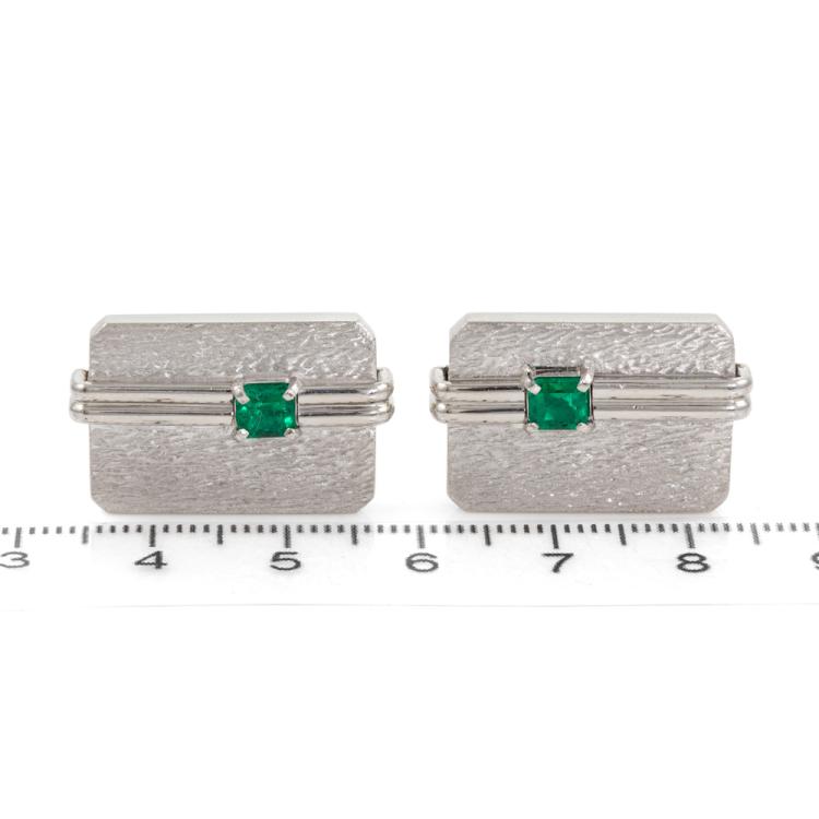 Cufflinks with 2 emerald cut natural Emeralds totalling 0.83ct. Platinum - 900 with brushed metal finish. Size: 2.0cm x 1.5cm. Weight: 32.8g. (Pre-owned)