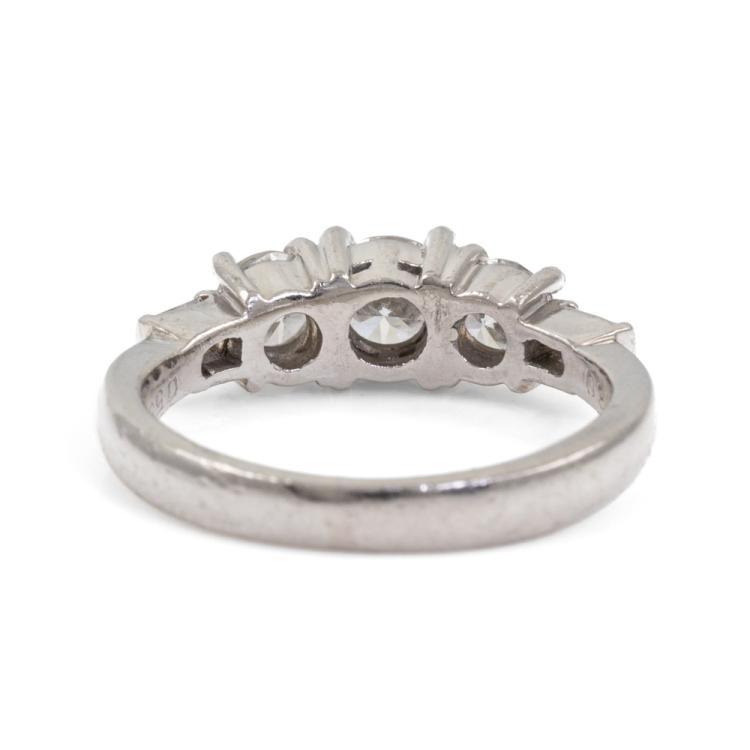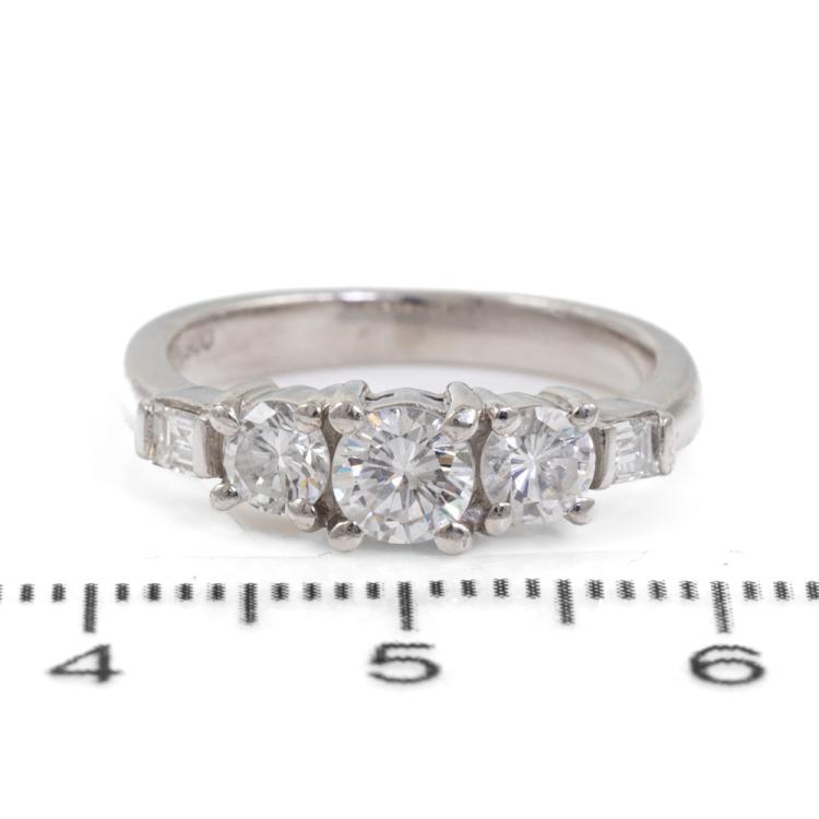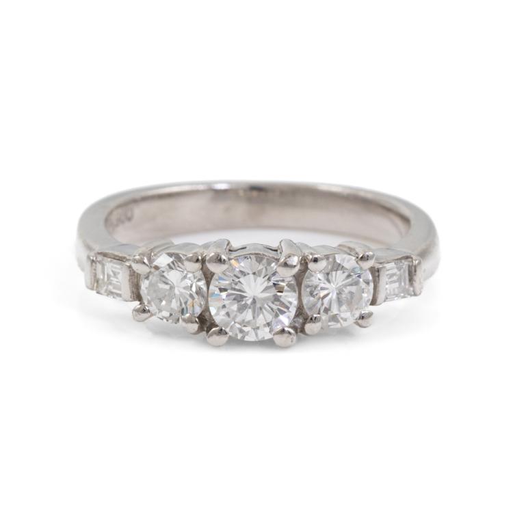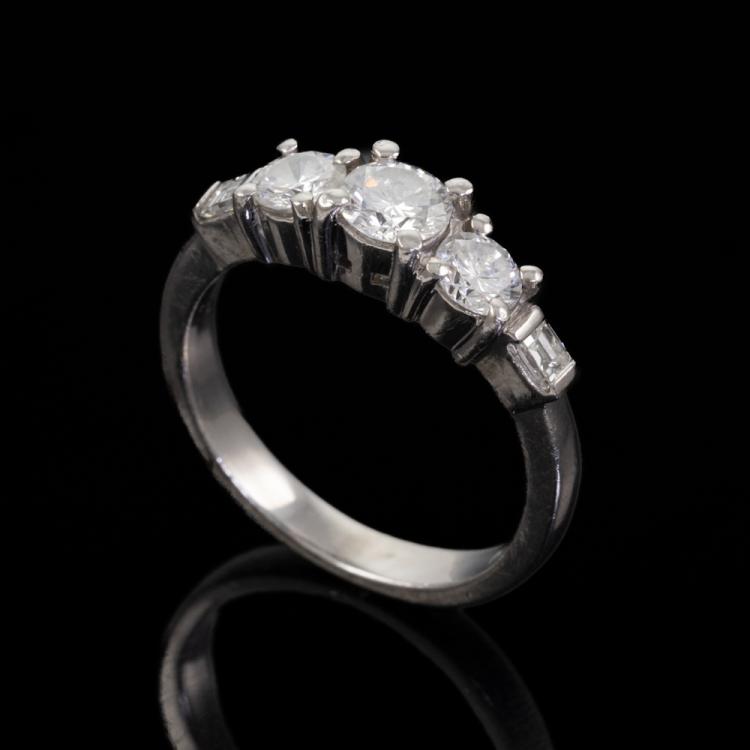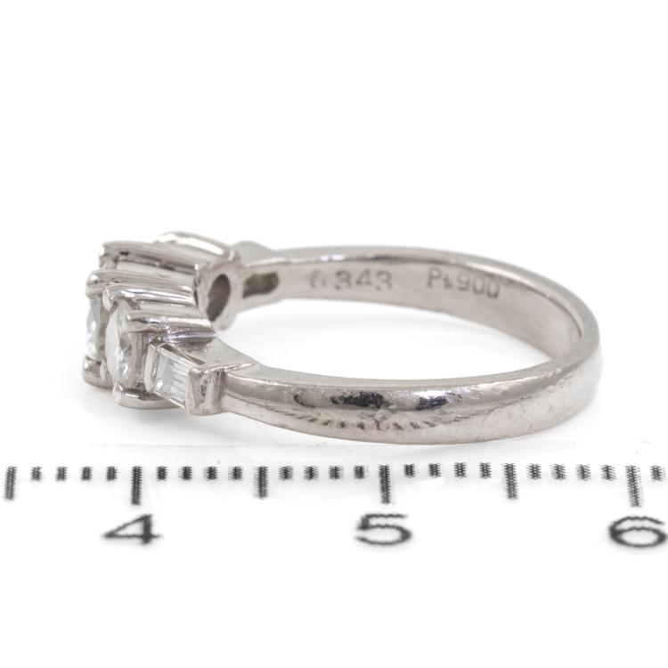 Diamond dress ring with 3 round and 2 baguette cut Diamonds totalling 0.89ct (Estimated grading: G-H VS-SI). Platinum - 900. Ring size J1/2. Band width 2.6mm - 1.9mm. Weight: 5.3g. (Pre-owned)