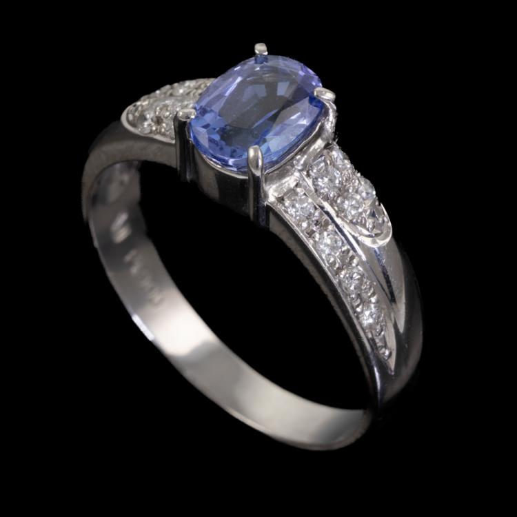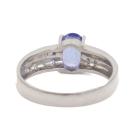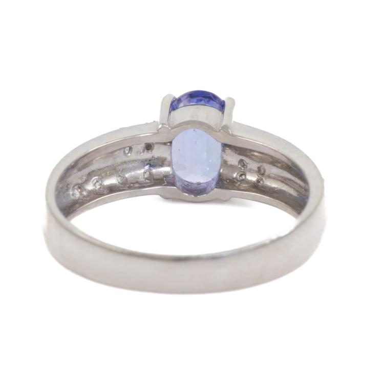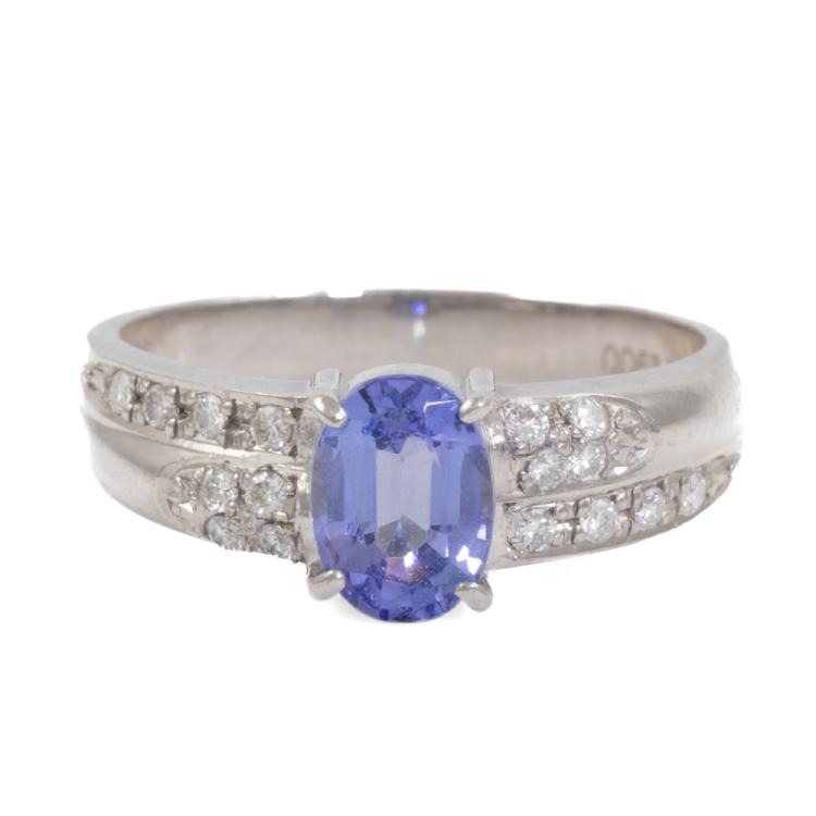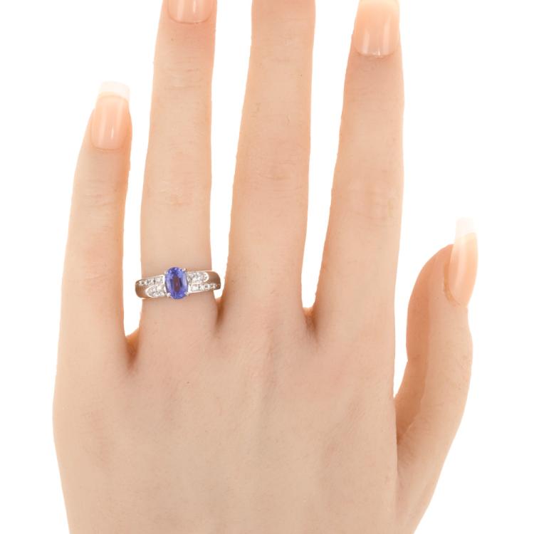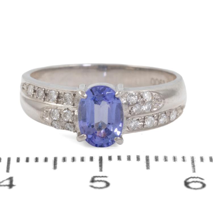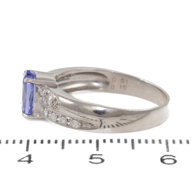 Tanzanite and Diamond ring with oval shape natural Tanzanite of 0.91ct and round natural Diamonds totalling 0.15ct. Platinum 900. Ring Size: M. Band width: 2.7mm - 4.1mm. Weight: 4.5g. (Pre-owned)