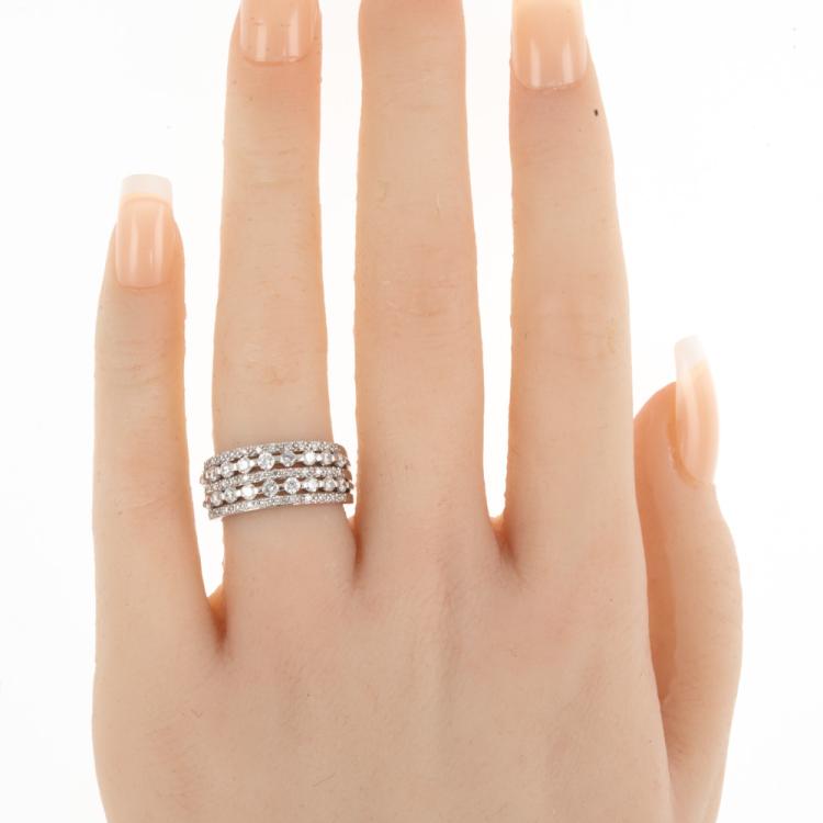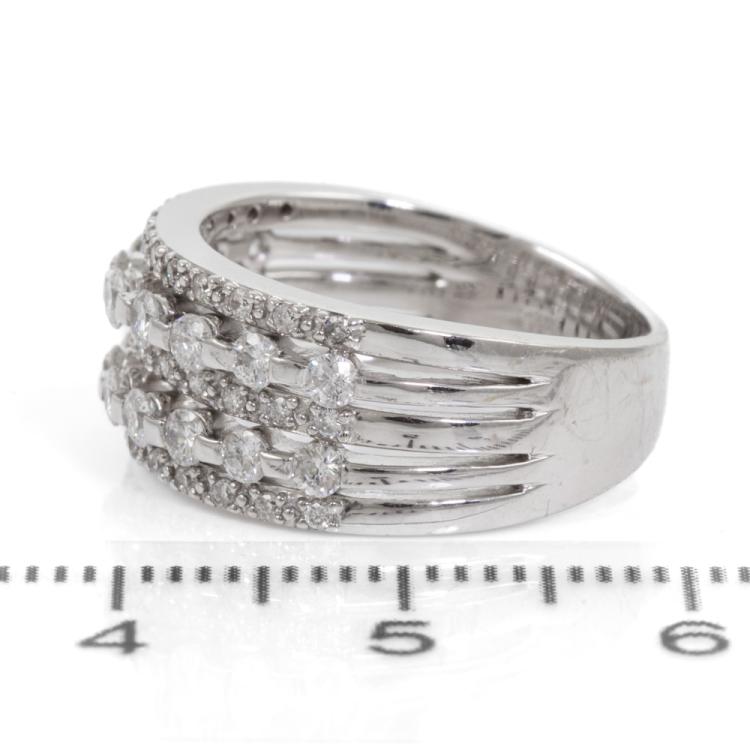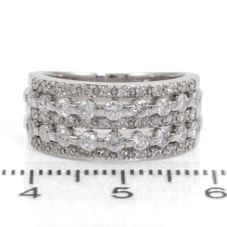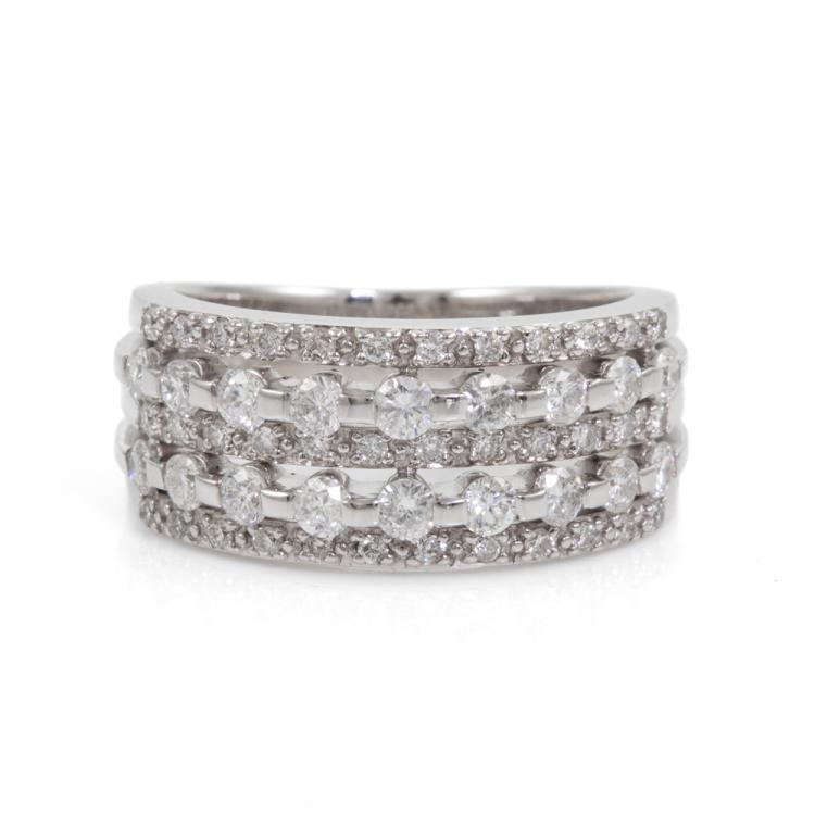 Diamond dress ring with round natural Diamonds totalling 0.99ct (Estimated grading: H P1). 18ct white gold. Ring size K. Band width: 4mm-7mm. Weight: 7g. (Pre-owned)
