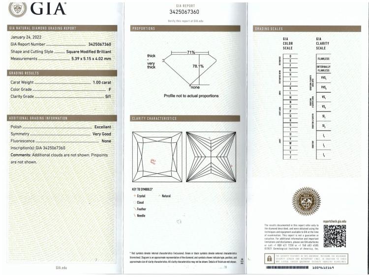 A loose princess cut Natural Diamond of 1.00ct (with GIA report graded as F S1#3425067360