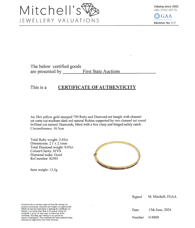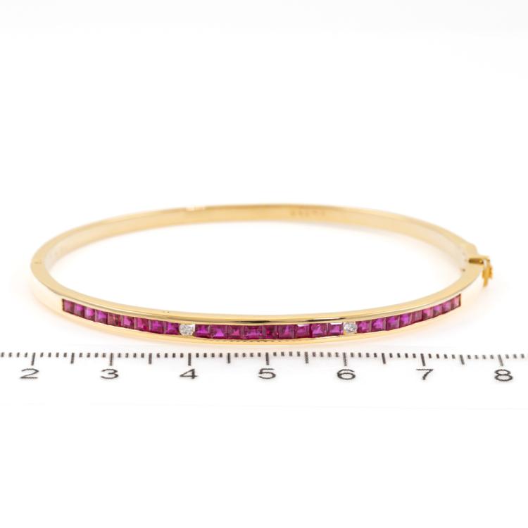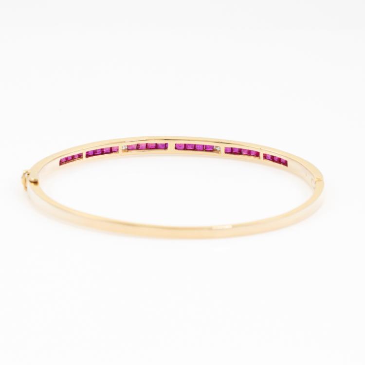 Ruby and Diamond oval bangle with carre cut natural Rubies totalling 1.00ct and round natural Diamonds totalling 0.04ct. Circumference: 16.5cm. 18ct yellow gold. Width: 2.5mm. Weight:13.5g. With Certificate #418800. (Pre-owned)