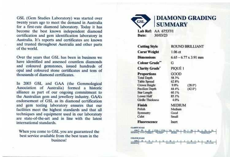 Diamond solitaire ring with round brilliant cut Natural Diamond of 1.06ct (With GSL Summary Report graded as: G P1 #AA67537/1). 18ct white gold. Ring size L1/2. Band width 3.4mm - 2.1mm. Weight 4.6g. (New)