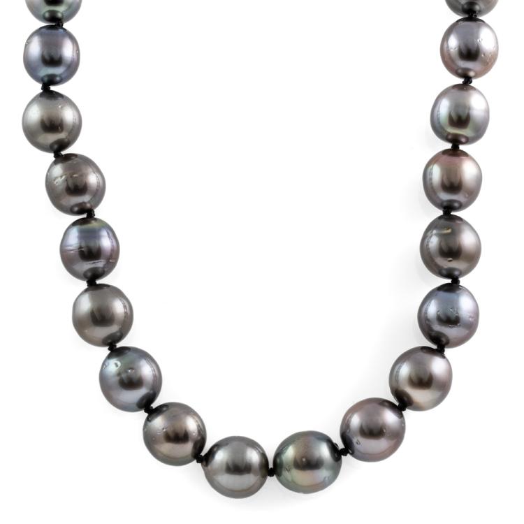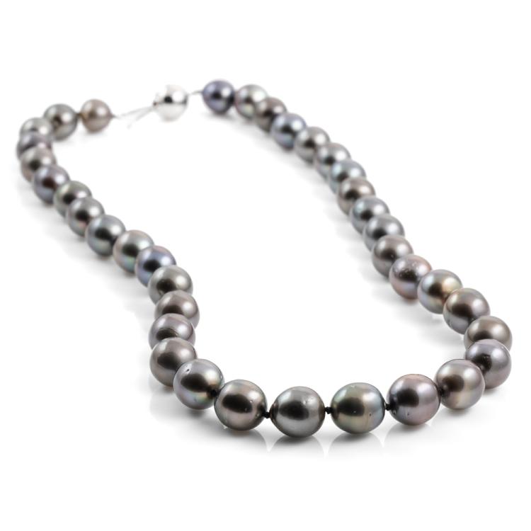 Pearl necklace with 37 slightly graduated Tahitian Pearl of 10.9mm - 9.3mm. 14ct white gold 10mm ball clasp. Length: 46cm. Weight: 63.7g. (Pre-owned)