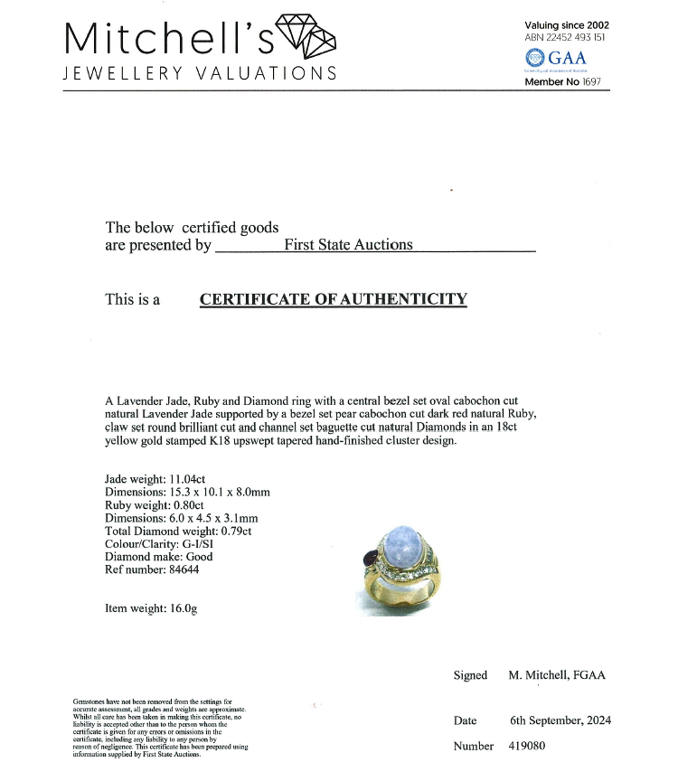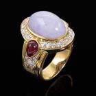 Jade, Ruby and Diamond ring with oval cabochon cut Natural Lavender Jadeite Jade - Type A of 11.04ct, pear shape cabochon cut Natural Ruby of 0.80ct and round & baguette cut Natural Diamonds totalling 0.79ct (Estimated grading: G-I SI). 18ct yellow gold. Ring size: N. Band width: 5.4mm-7.8mm. Weight: 16.0g. With Certificate #419080. (Pre-owned)