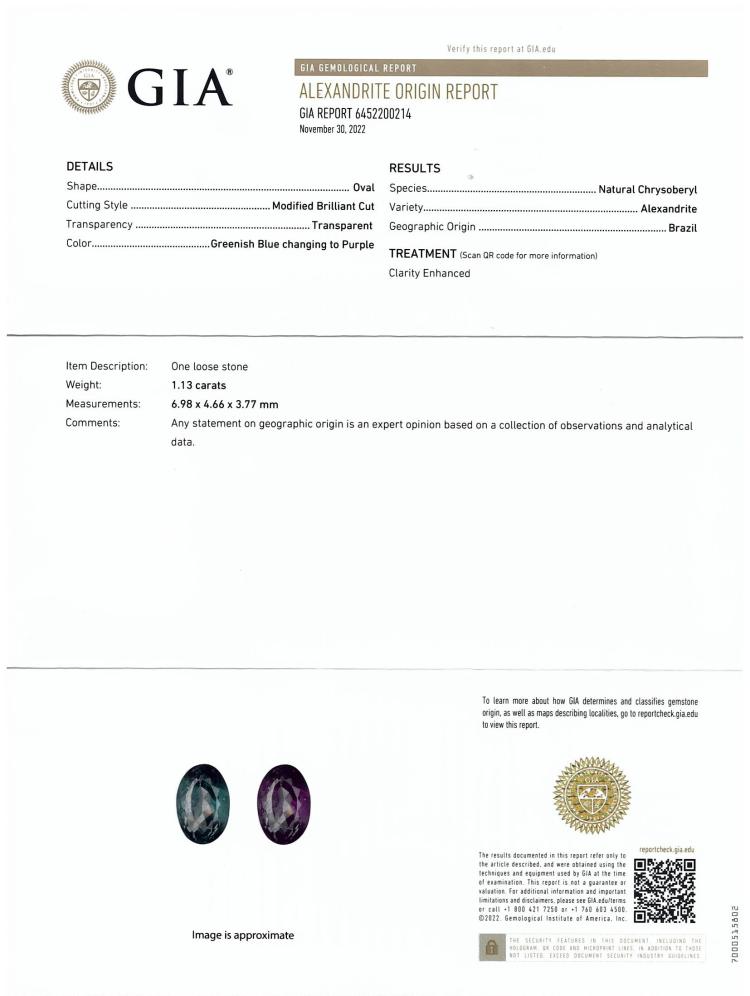 A loose oval shape Brazilian Natural Alexandrite of 1.13ct (with GIA Report #6452200214 stating colour change from Greenish blue to purple) (As new)