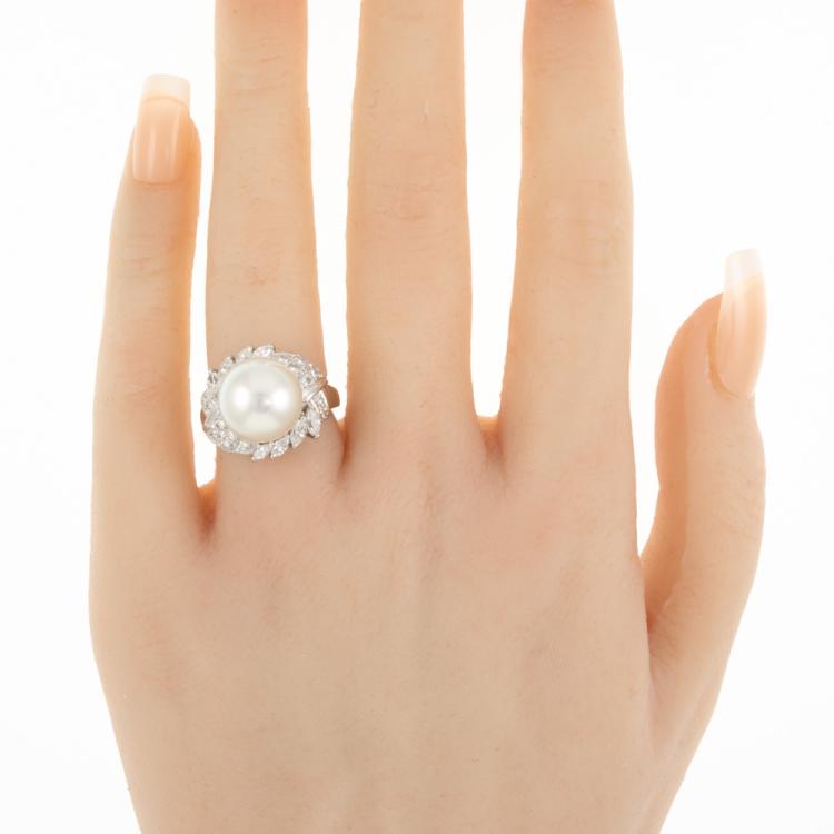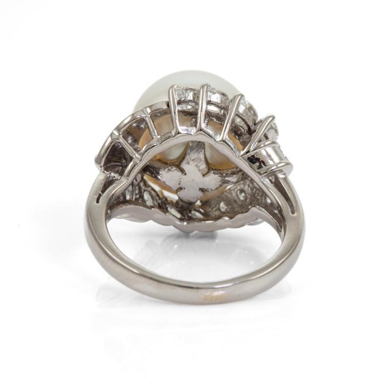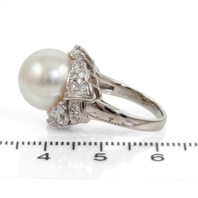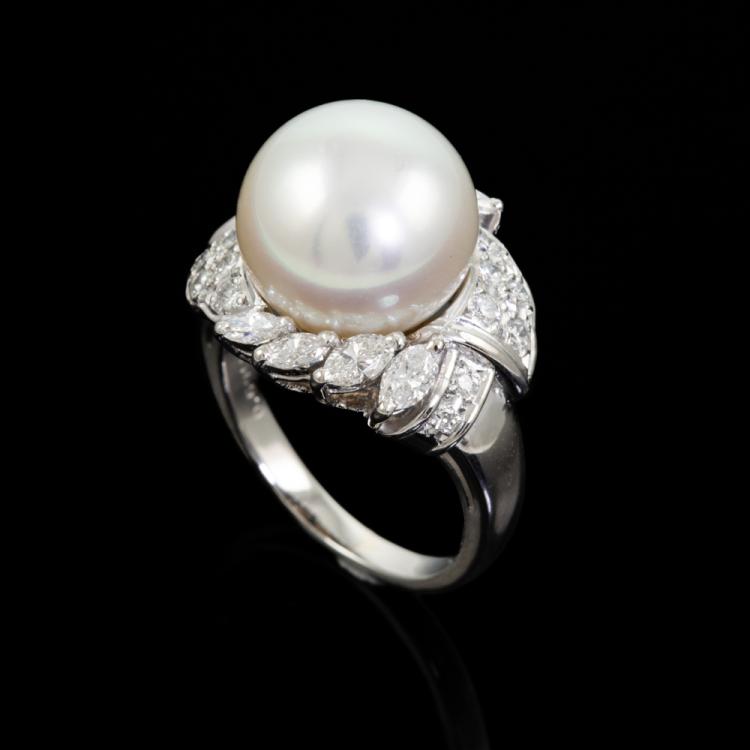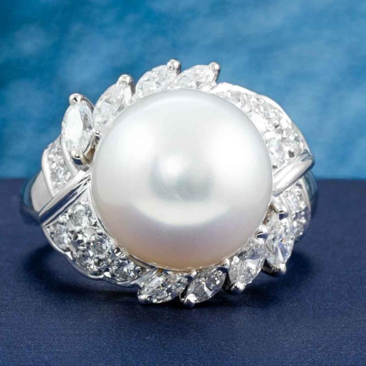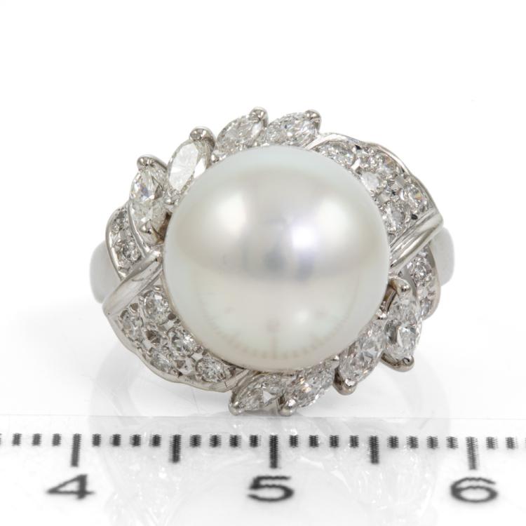 Pearl and Diamond ring with South Sea Pearl of 11.5mm and round & marquise cut natural Diamonds totalling 0.69cts (Estimated grading: G-H VS-SI). Platinum 900. Ring size H1/2. Band width: 2.1mm - 3.9mm. Weight: 9.6g. (Pre-owned)