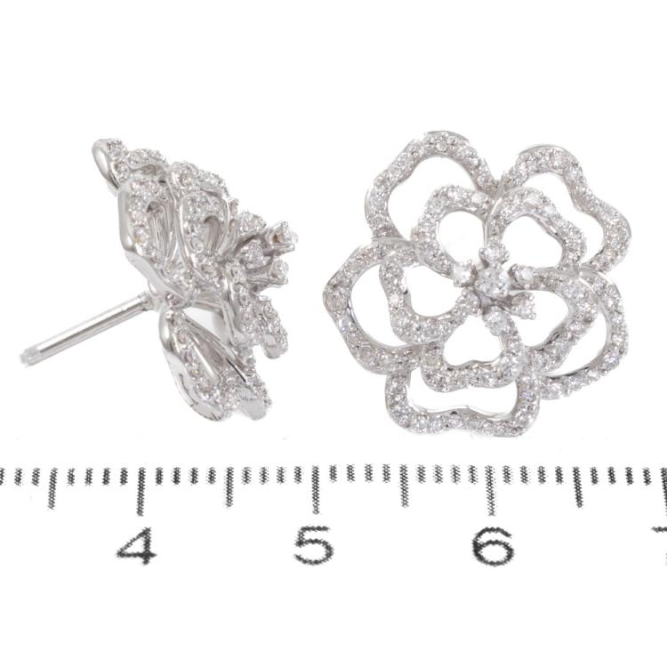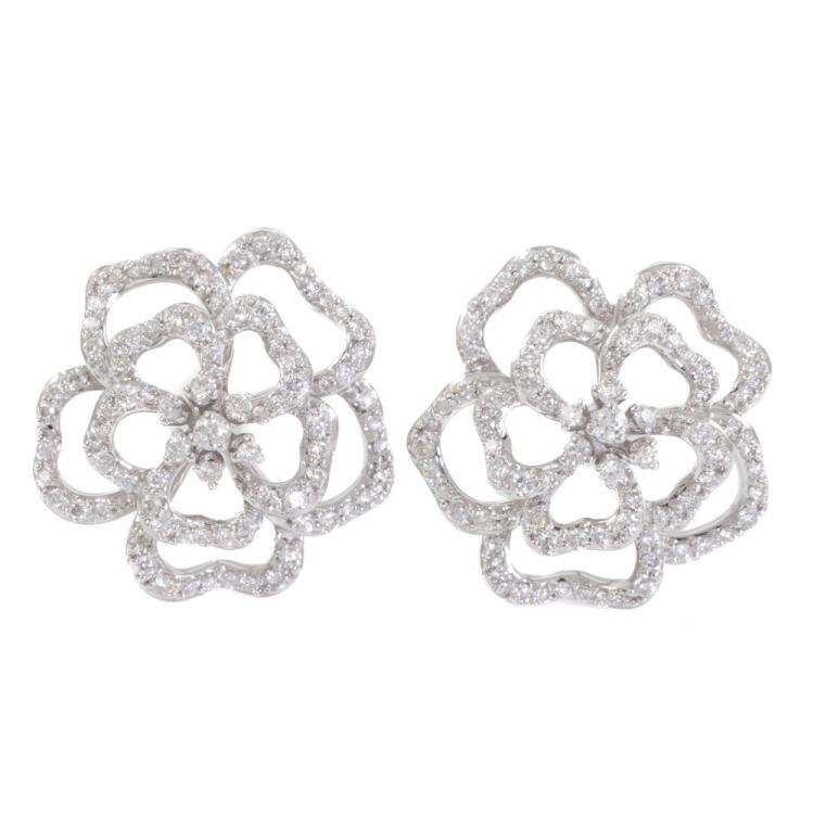 Diamond Flower design earrings with round natural Diamonds totalling 1.16ct (Estimated grading G-H SI). 18ct white gold with silicon backs. Weight: 7.5g. (Pre-owned)