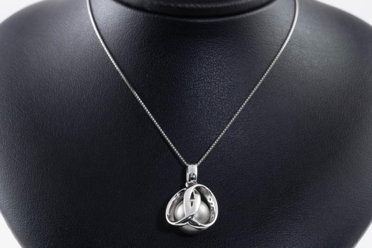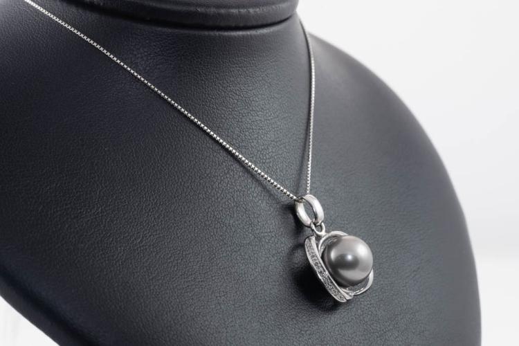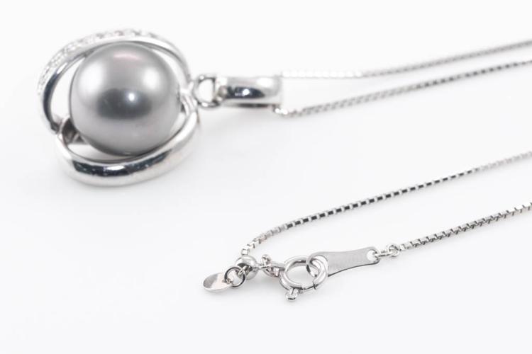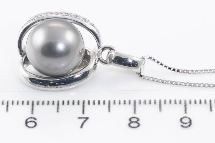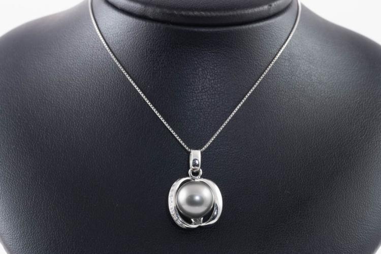 Pearl and Diamond pendant with Tahitian Pearl of 11.8mm and round Diamonds totalling 0.07ct. 18ct white gold with 44cm 18ct white gold adjustable chain. Weight: 8.6g. (Pre-owned)