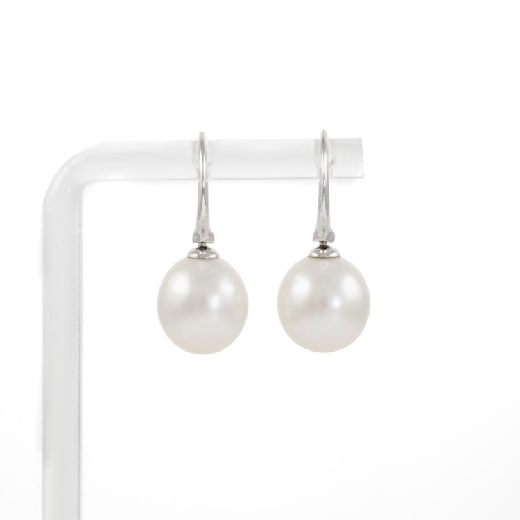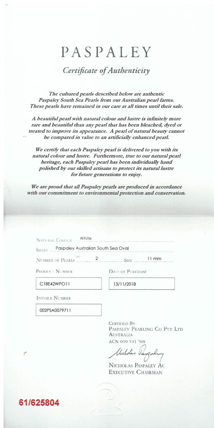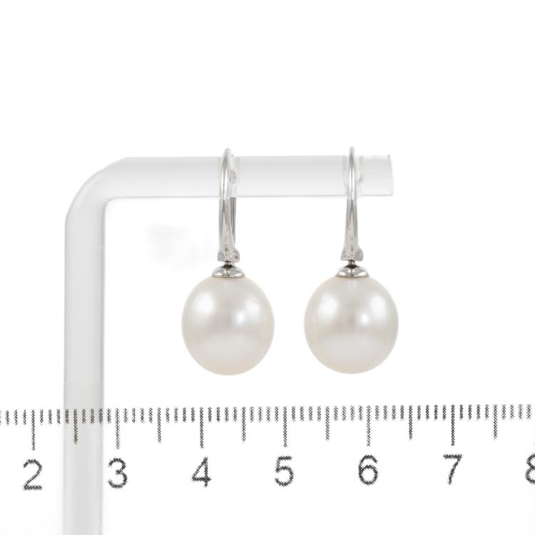 Paspaley shepherds hook drop earrings with oval shape Australian South Sea pearls of 11mm. Length of earrings: 2.5cm. 18ct white gold. Weight: 6.5g. With Paspaley Certificate of Authenticity dated 13/11/18. With Paspaley pouch and box. (Pre-owned)