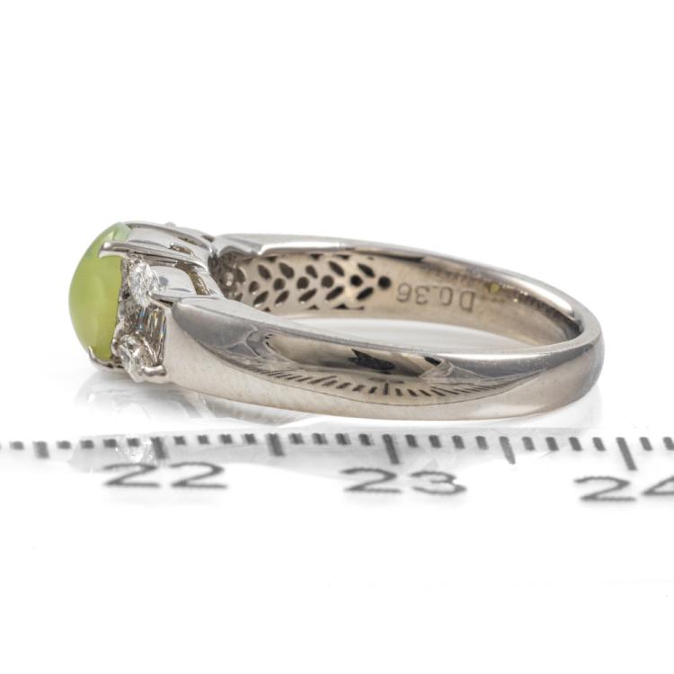 Chrysoberyl and Diamond ring with natural Chrysoberyl Cat's Eye of 1.20ct and natural round and marquise cut Diamonds totalling 0.36cts (Estimated grading: G-H SI). Platinum 900. Ring size L. Band width: 2.75mm - 4.0mm. Weight: 5.6g. (Pre-owned)