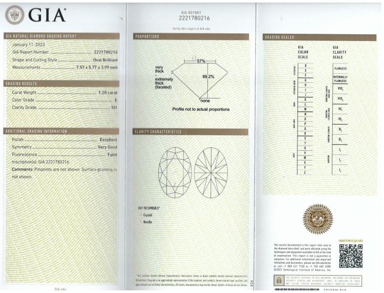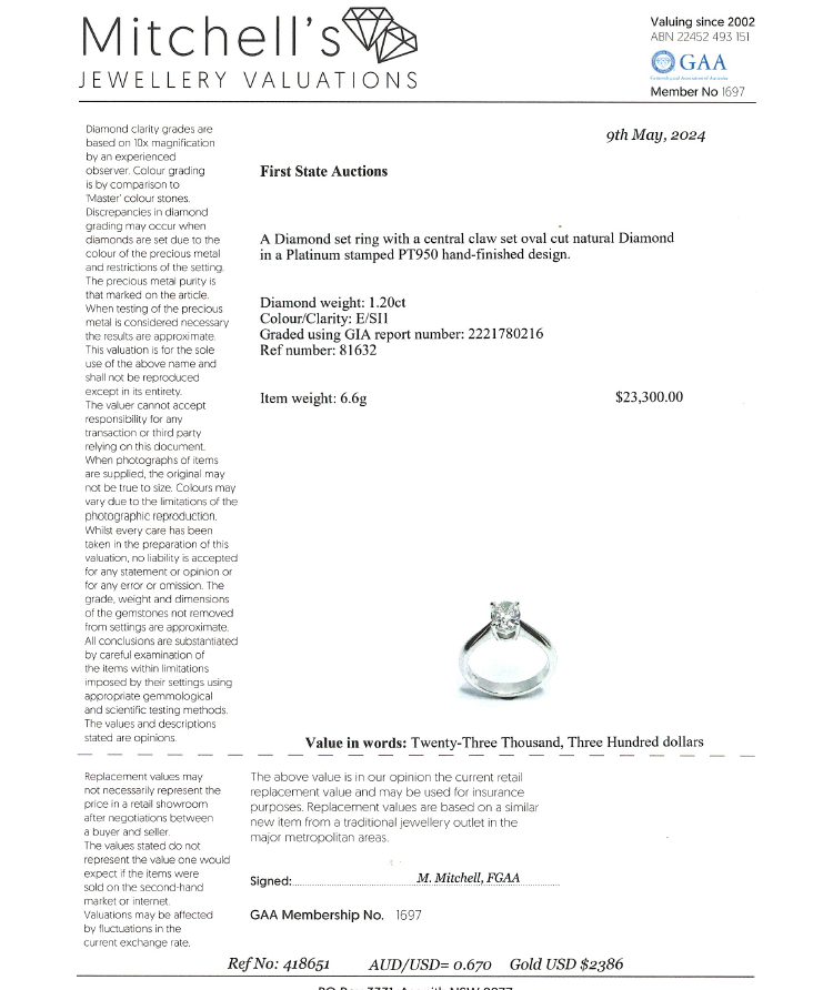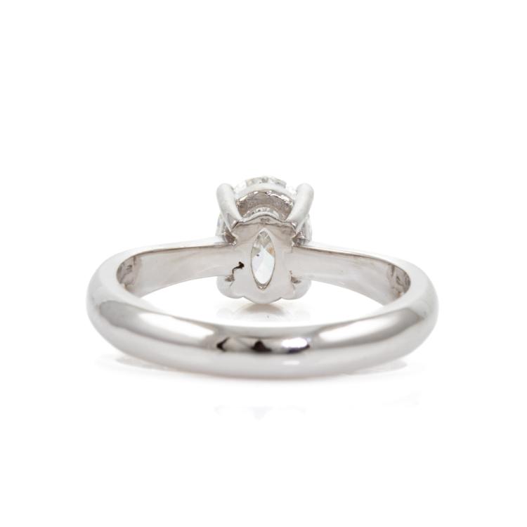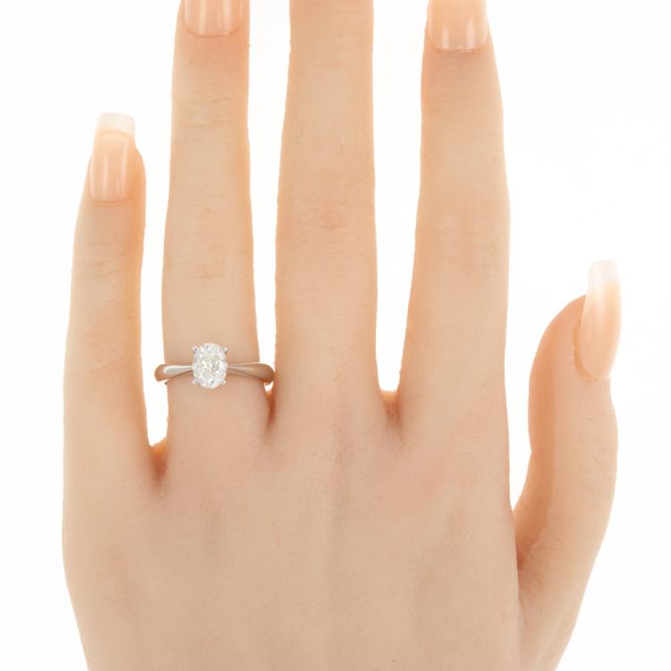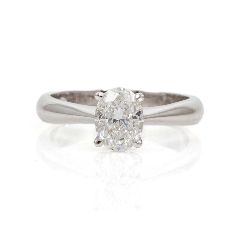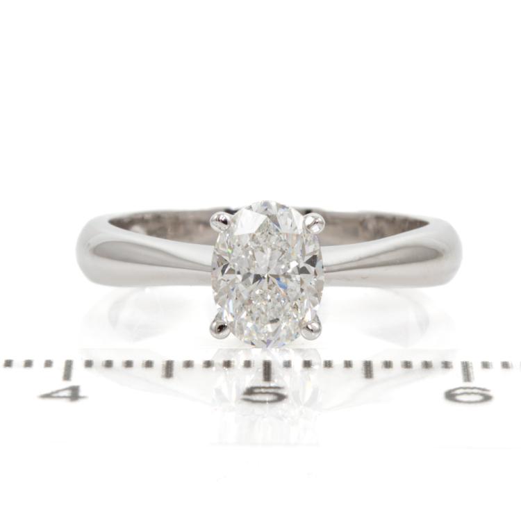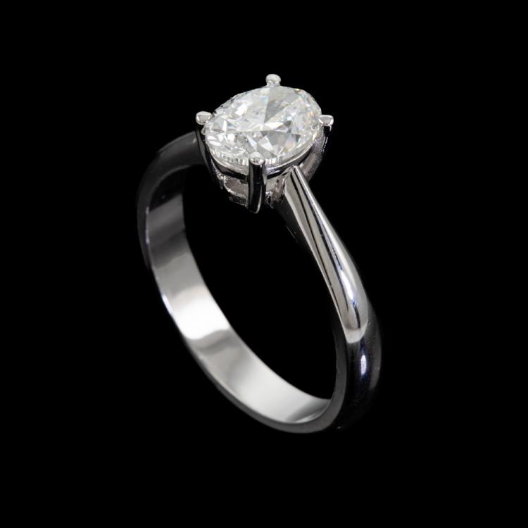 Diamond solitaire ring with oval shape Natural Diamond of 1.20ct (with GIA Report graded as E SI1 #2221780216). Platinum. Ring size L½. Band width: 3.1mm - 2.0mm. Weight 6.6g. With Valuation Certificate #418651. (New)