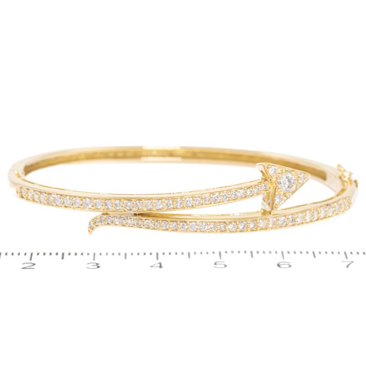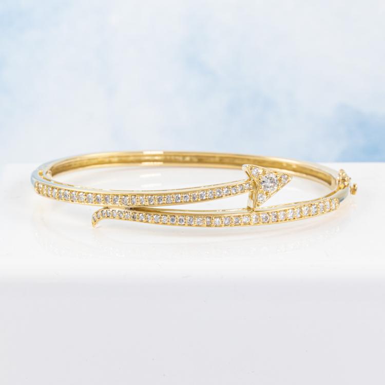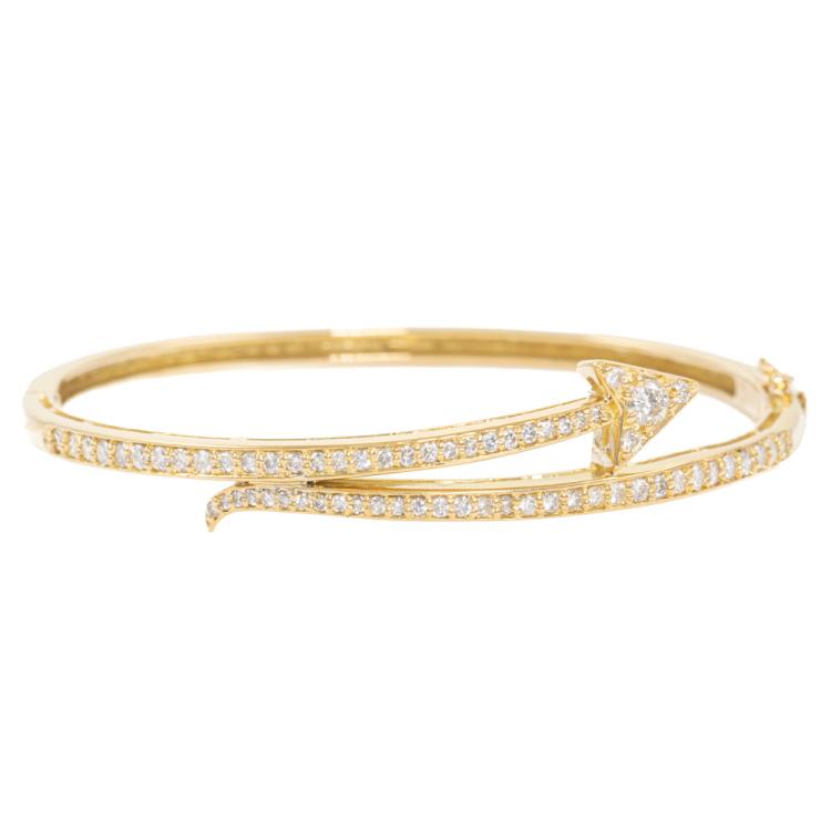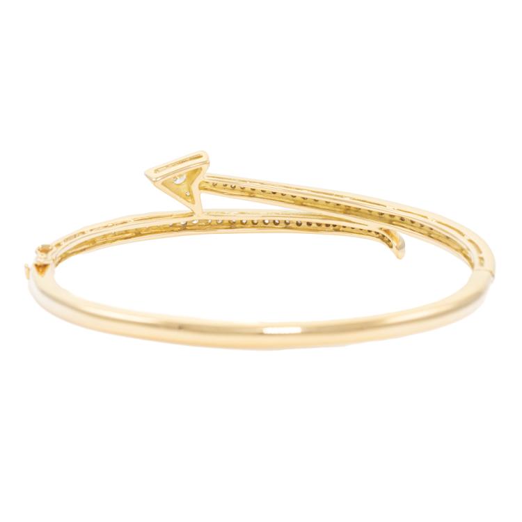 Diamond arrow design bangle with round Natural Diamonds totalling 1.21ct (Estimated Grading: I-J SI). 18ct yellow gold. Inner circumference: 16.5cm. Weight: 18.0g. With Valuation Certificate #419092. (Pre-owned)