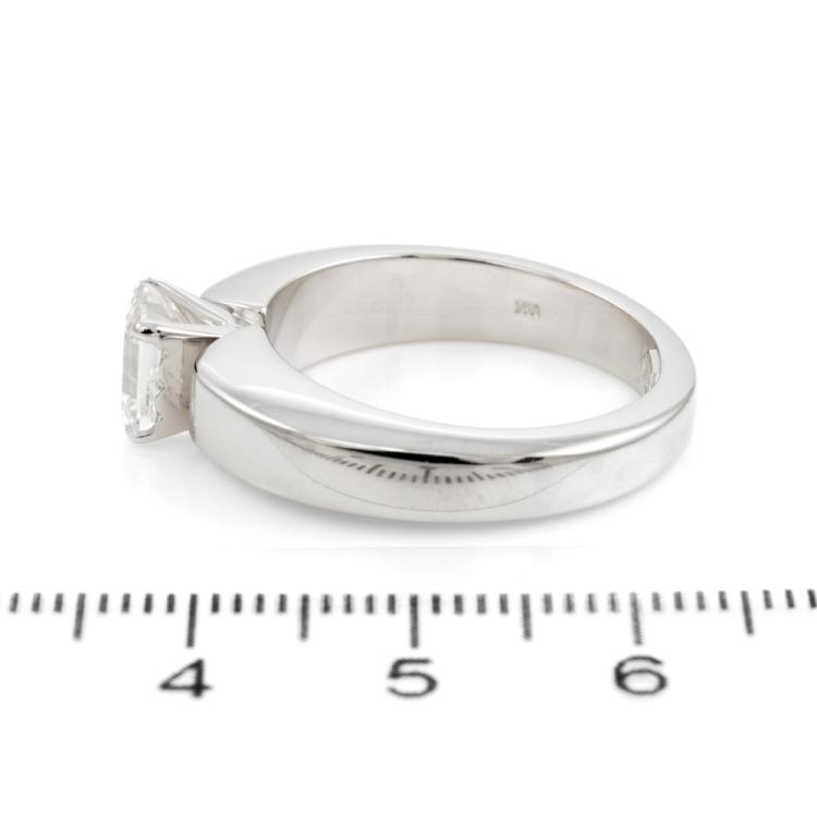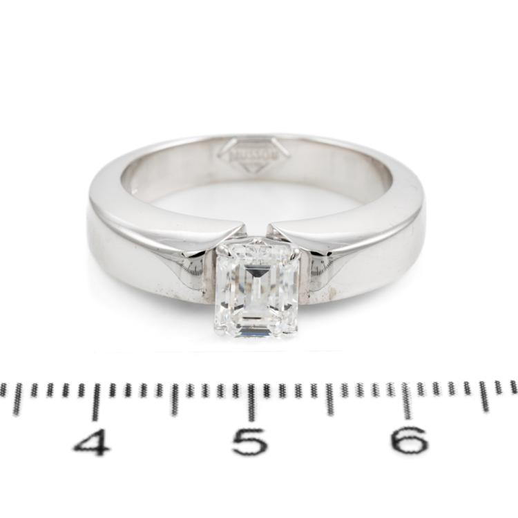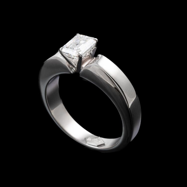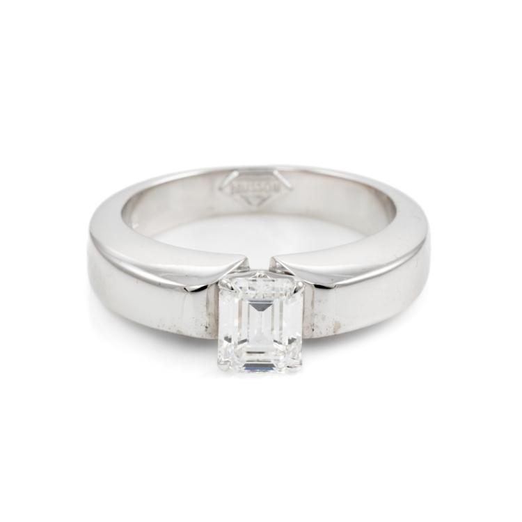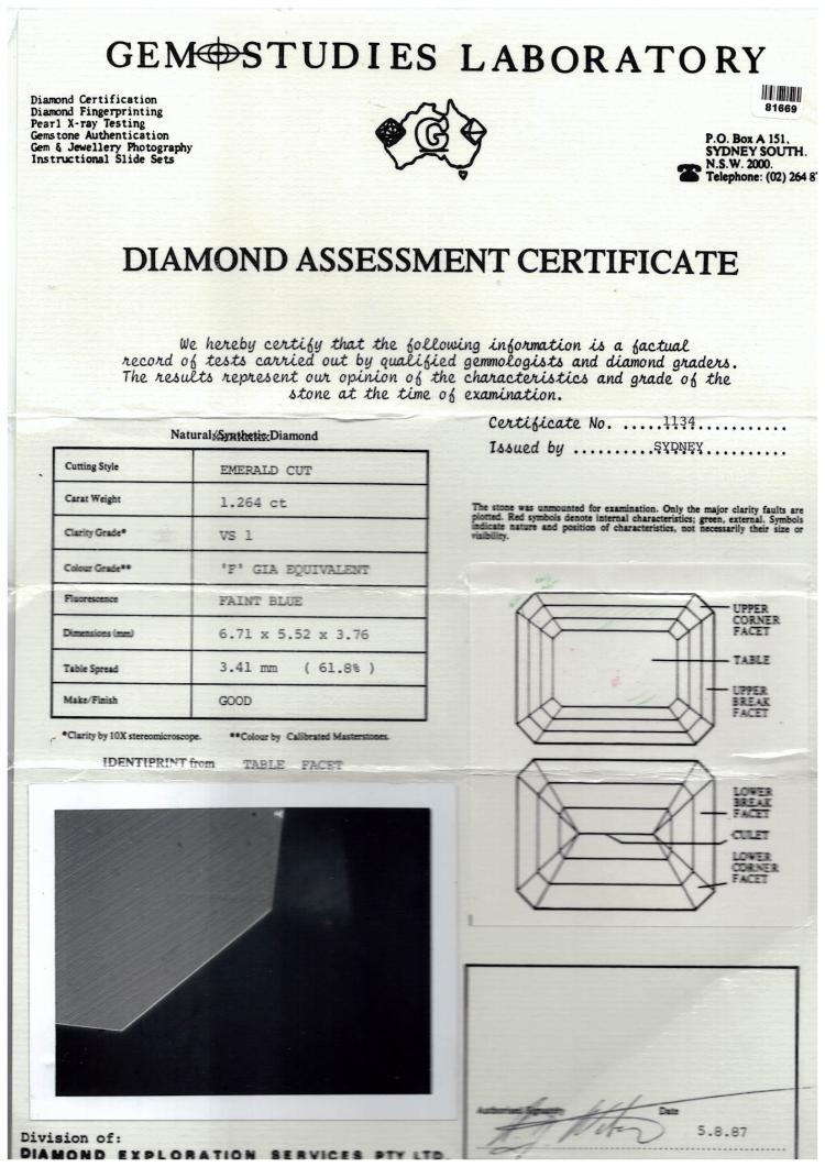 Musson Diamond engagement ring with an emerald cut natural Diamond of 1.26ct (GSL graded as F VS1). 18ct white gold. Ring size R. Band width: 3.8- 5.5mm. Weight: 14.5g. With GSL Report #1134 dated 5/8/87. (Pre-owned)