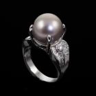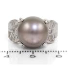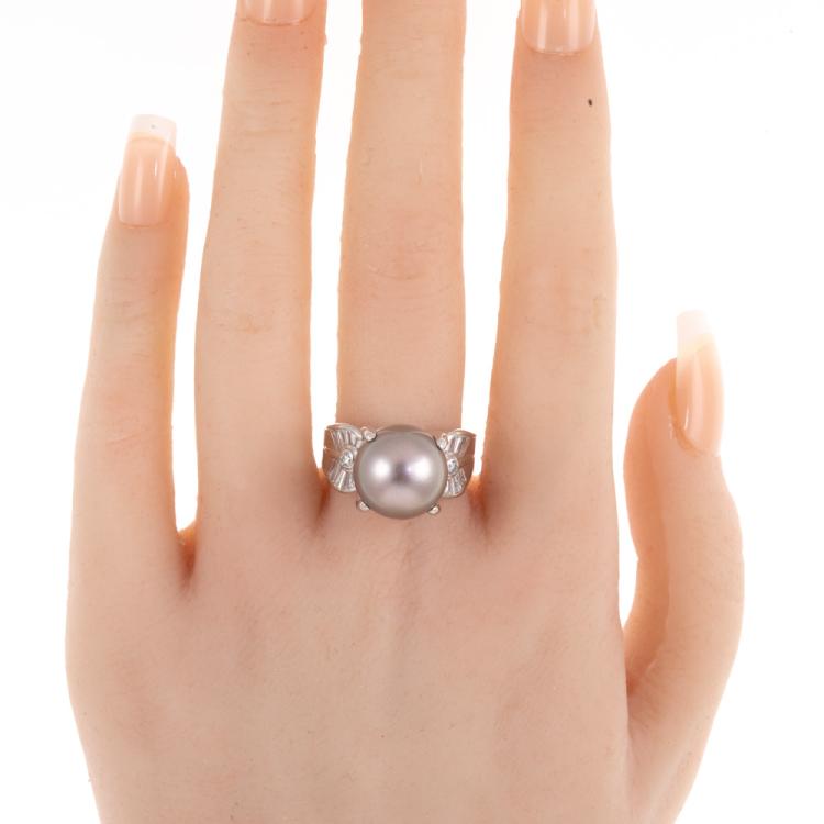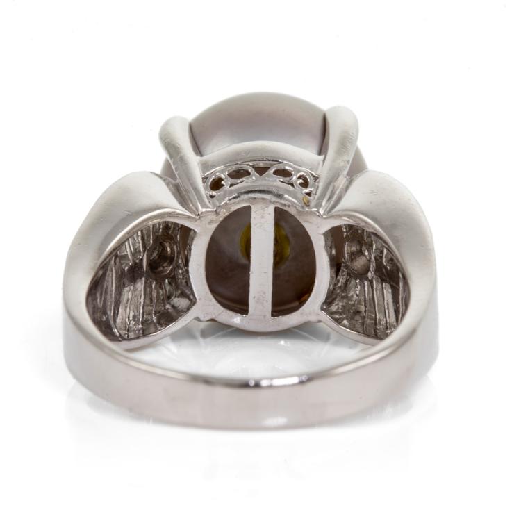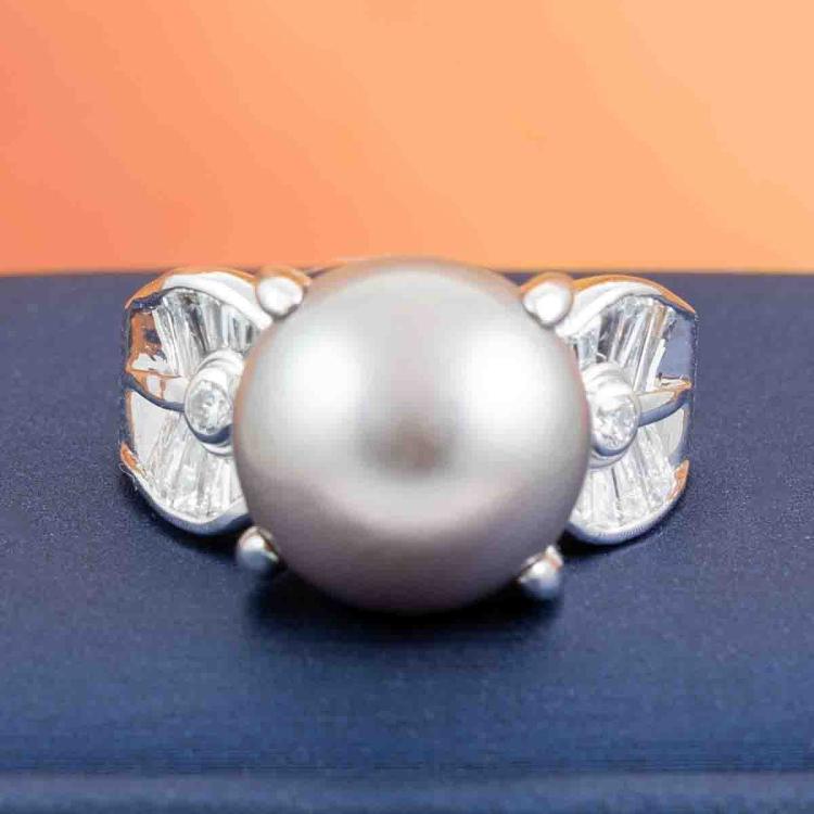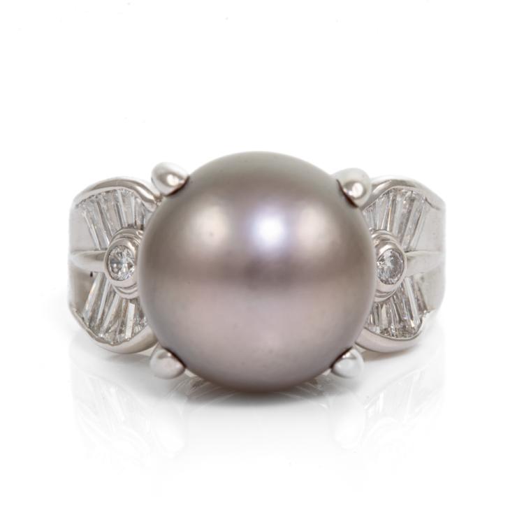 Pearl and Diamond ring with Tahitian Pearl of 12.6mm and round & baguette cut Natural Diamonds totalling 0.80ct (Estimated grading: H-I SI). Platinum 900. Ring size O. Band width: 5.4mm - 3.1mm. Weight: 14.0g (Pre-owned)