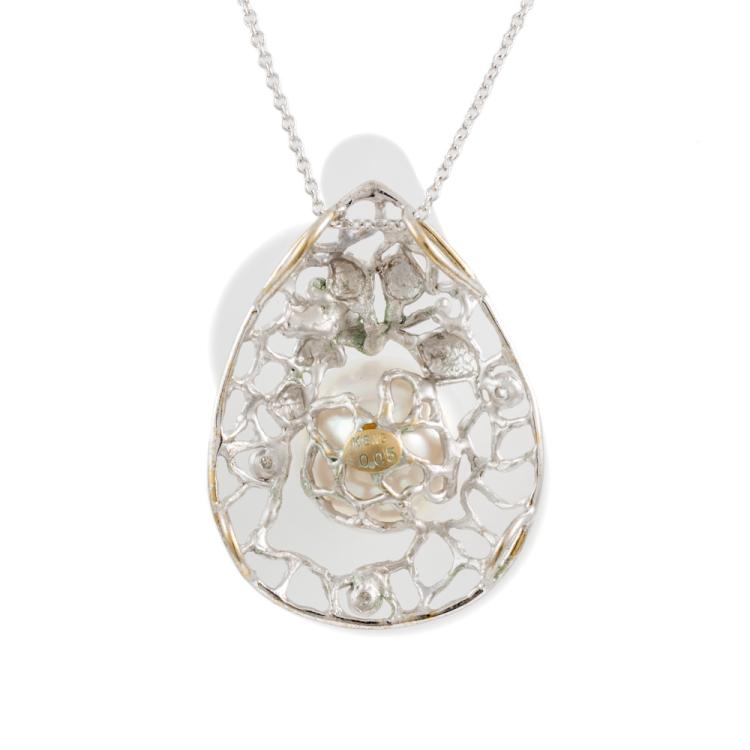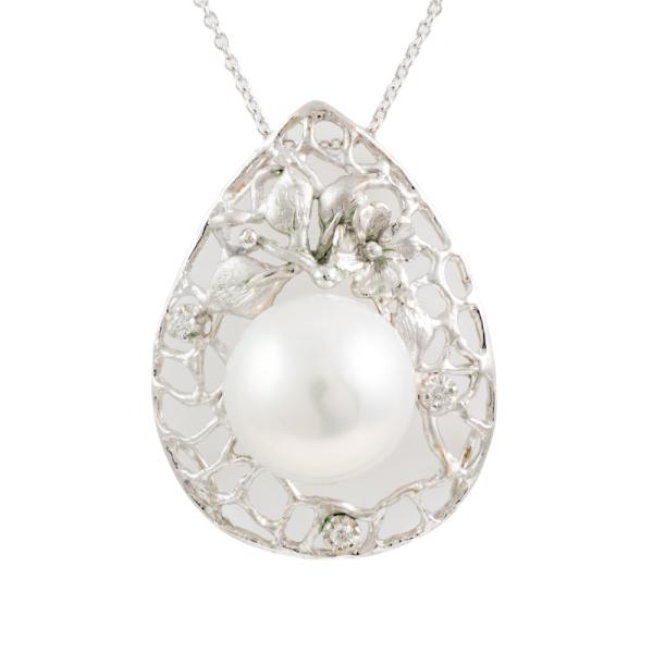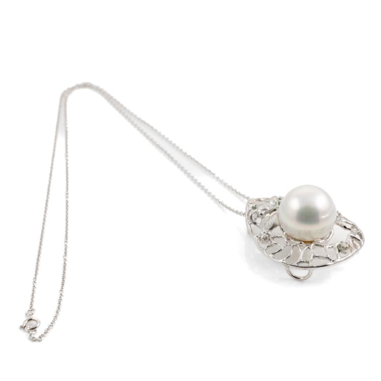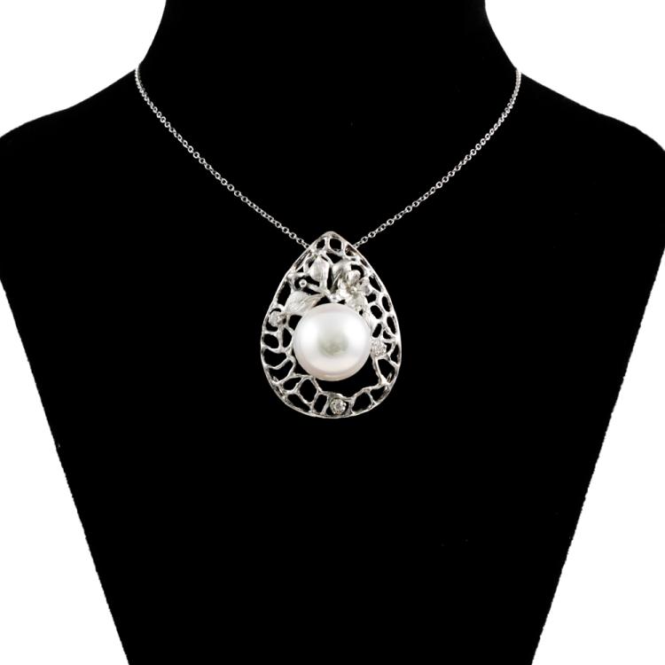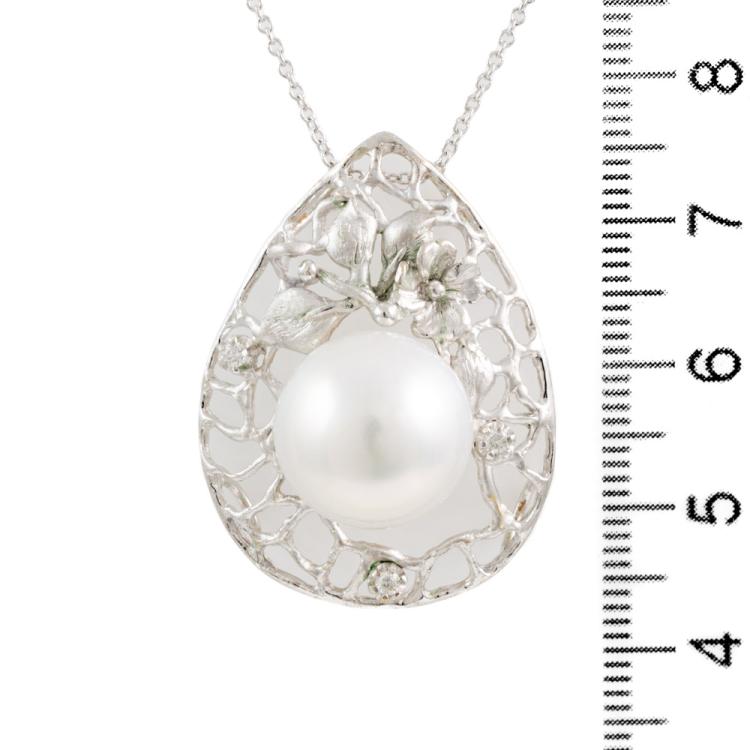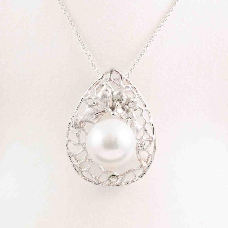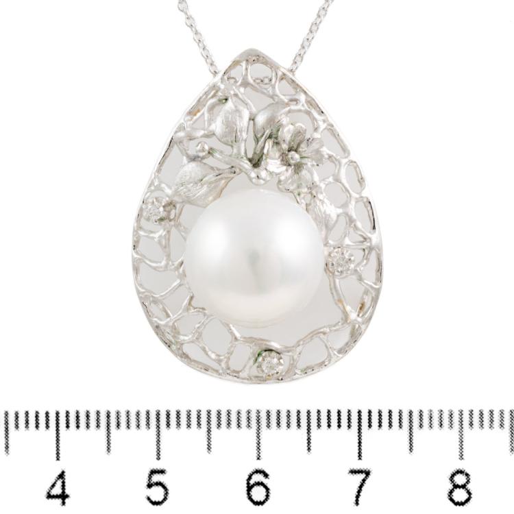 Pearl and Diamond pendant with South Sea Pearl of 13.3mm and round Natural Diamonds totalling 0.05ct. 18ct white gold with 14ct white gold 40cm chain. Weight: 9.4g. Note - Rhodium plating faded. (Pre-owned)