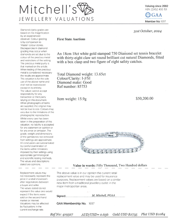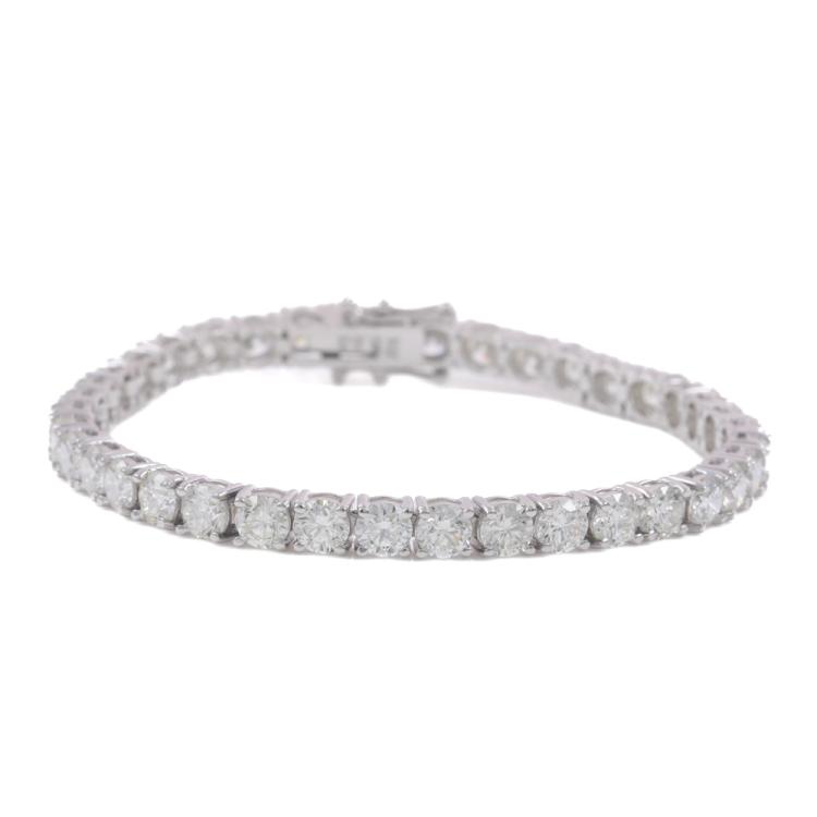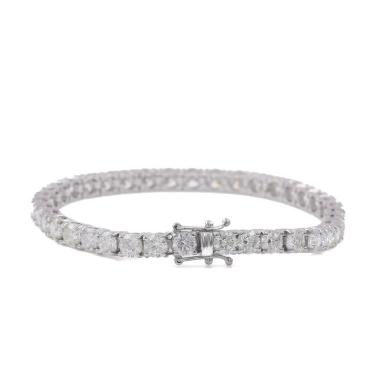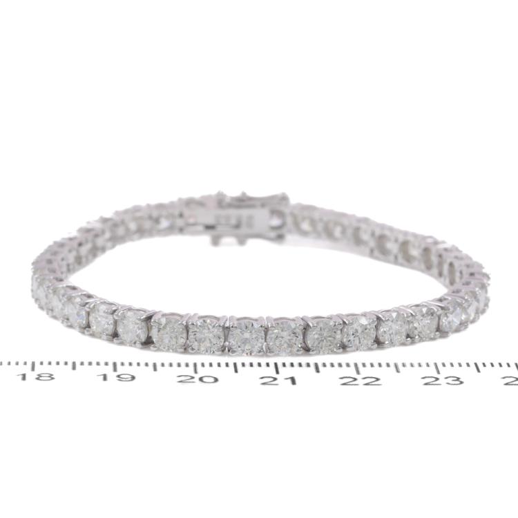 Diamond tennis bracelet with 38 round Natural Diamonds totalling 13.65ct (Estimated grading: I-J SI). 18ct white gold. Length: 18cm. Weight: 15.9g. With Valuation Certificate #419327. (New)