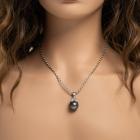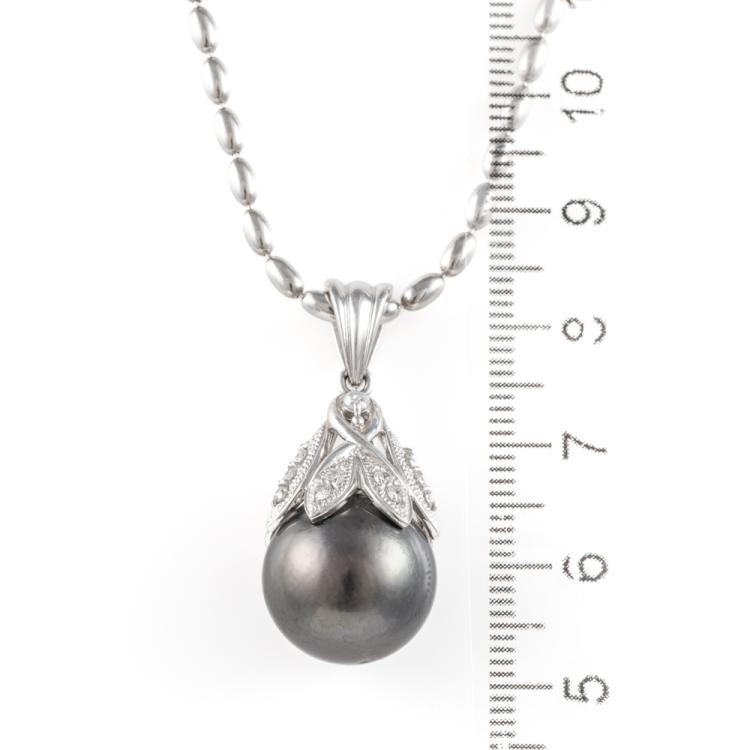 Pearl and Diamond pendant with a Tahitian Pearl of 14.2mm and round Natural Diamonds totalling 0.24ct. Platinum 900 with platinum 850 chain. Length: 44.5cm. Weight: 21.1g. (Pre-owned)