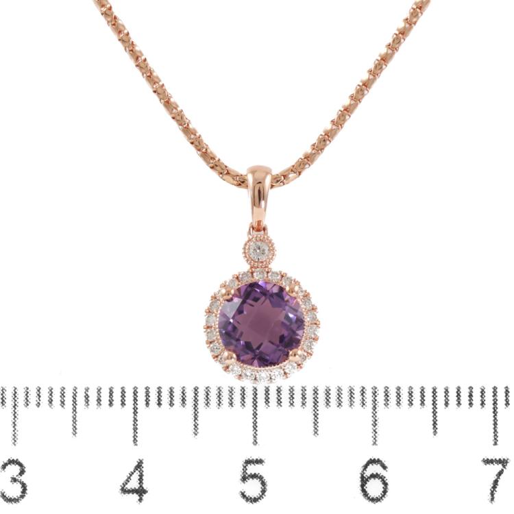 Amethyst and Diamond pendant with a round Natural Amethyst of 1.43ct and round Natural Diamonds totalling 0.15ct. 14ct rose gold with 18ct rose gold adjustable 45.5cm chain. Weight: 4.2g. (New)