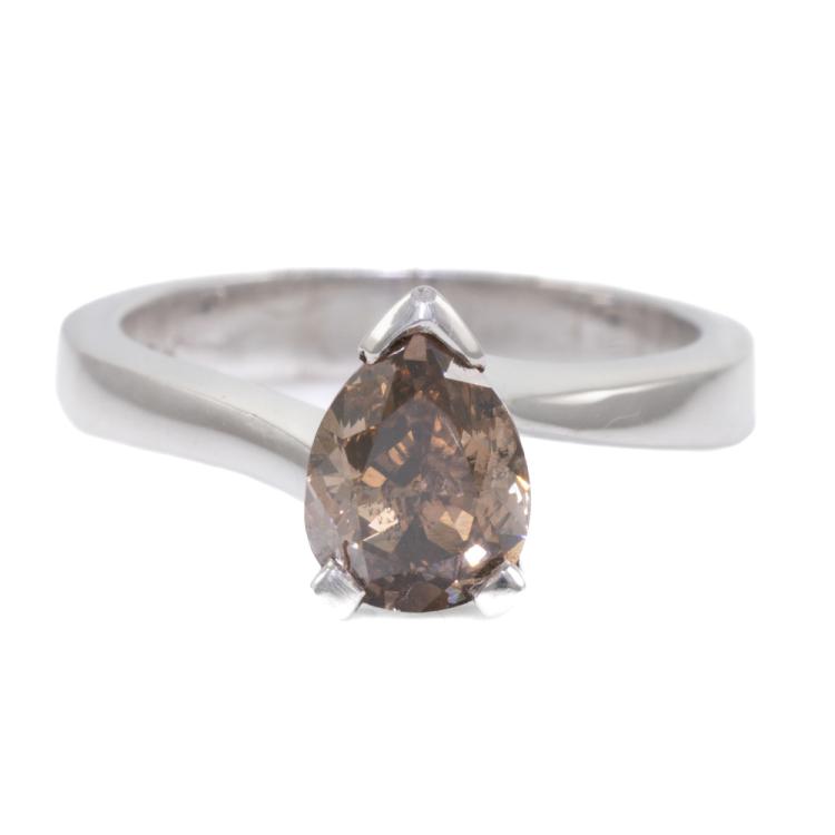 Diamond solitaire ring with a pear shape natural Diamond of 1.45ct (Estimated grading: Dark Champagne - P1). 18ct white gold. Ring size L. Band width: 3.4mm-1.6mm. Weight: 5.7g. (As new)