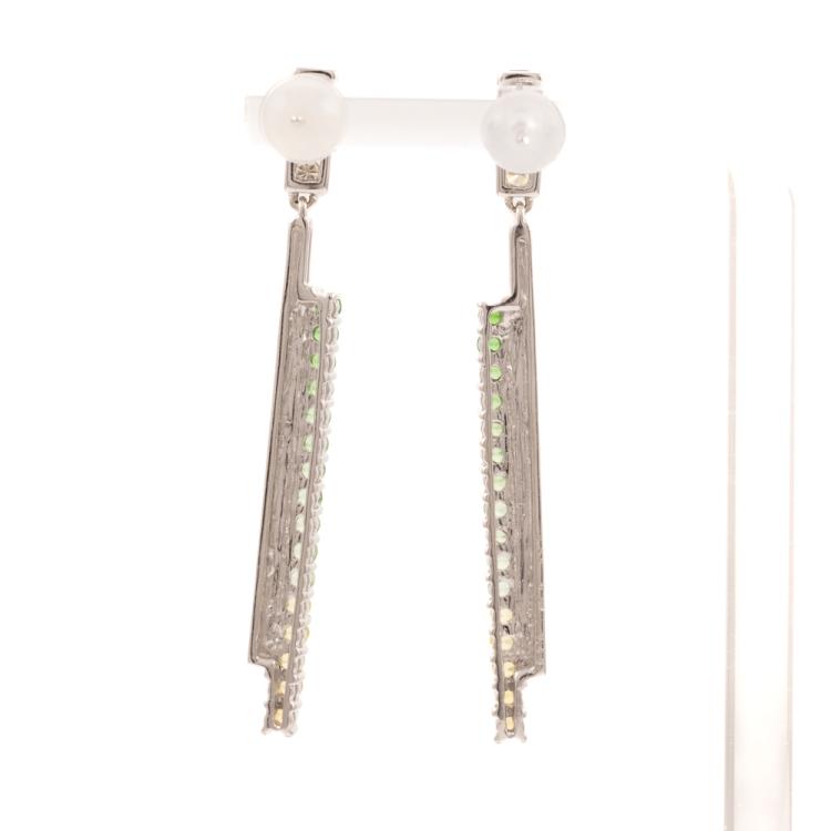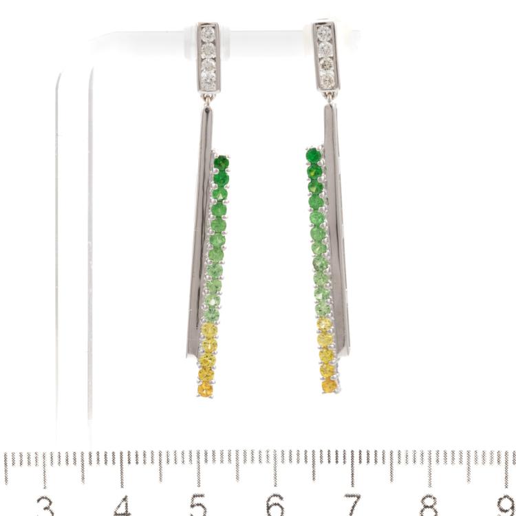 Garnet and Diamond earrings with round natural green & yellow Garnets totalling 0.96ct and round natural Diamonds totalling 0.28ct. 18ct white gold with silicon backs. Weight: 7.0g. (pre-owned)