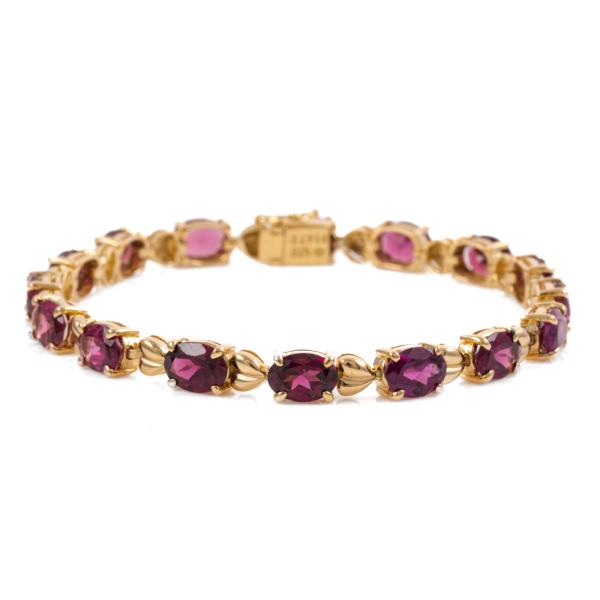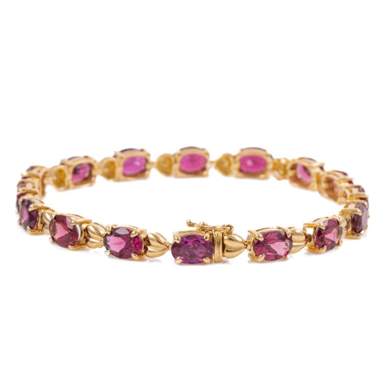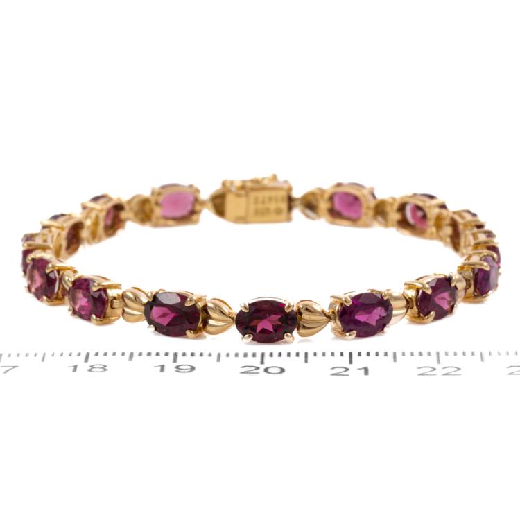 Garnet bracelet with 16 oval shape Natural Rhodolite Garnets totalling 14.72ct. 18ct yellow gold. Length: 17.5cm. Weight: 13.7g. (Pre-owned)