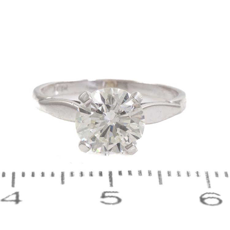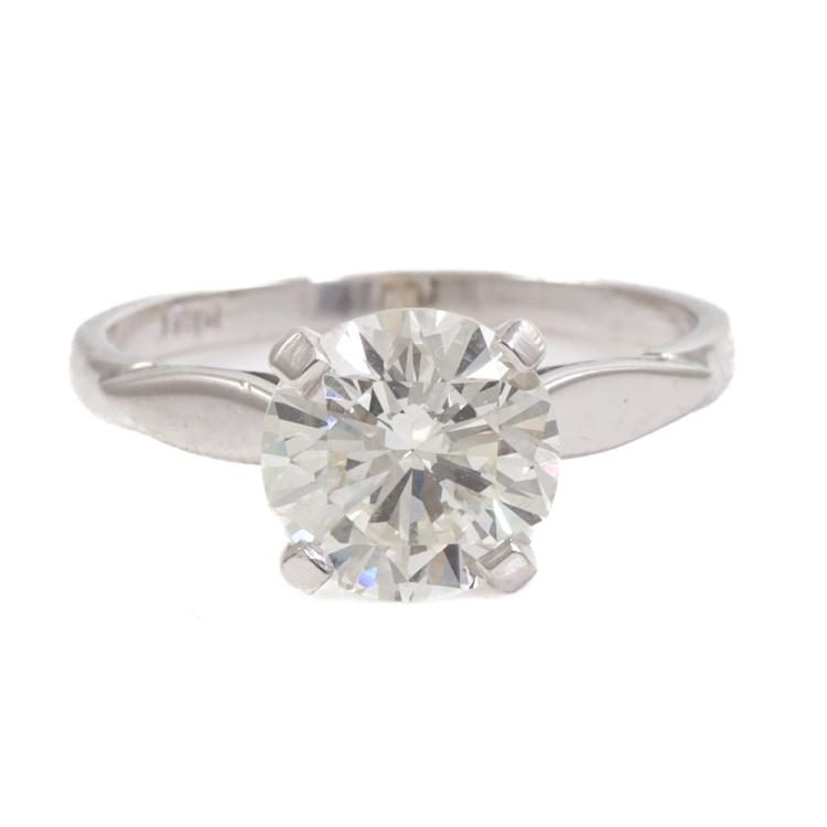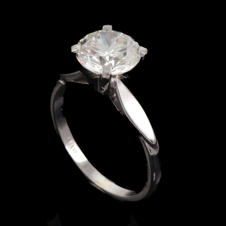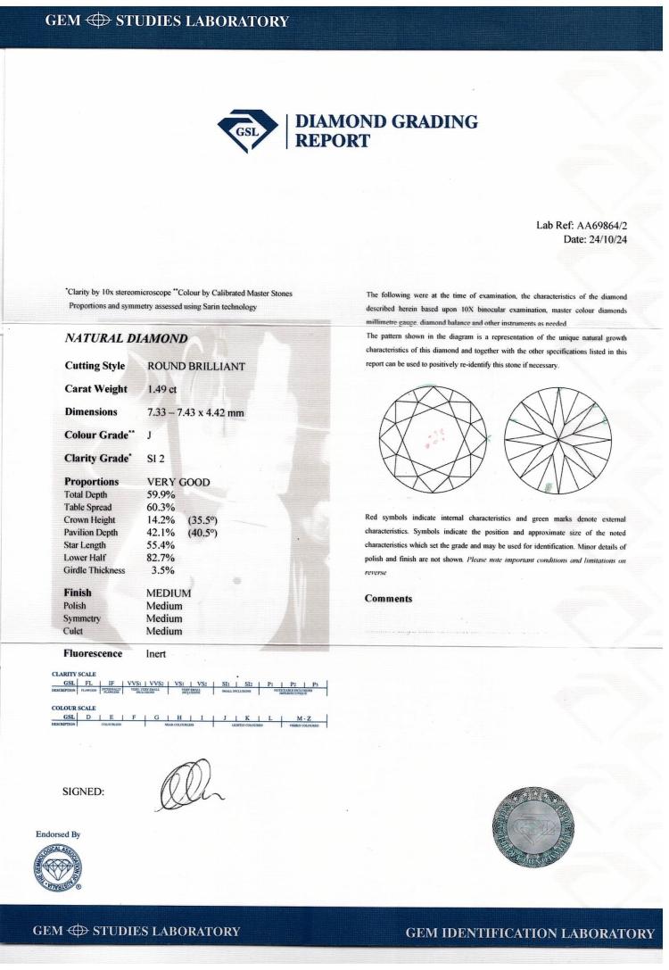 Diamond solitaire ring with round brilliant cut Natural Diamond of 1.49ct (With GSL Report graded as J SI2 #AA69864/2). 14ct white gold (XRF tested, stamped 18ct). Ring size: G1/2. Ring band: 1.6mm. Weight: 2.4g. (Pre-owned)