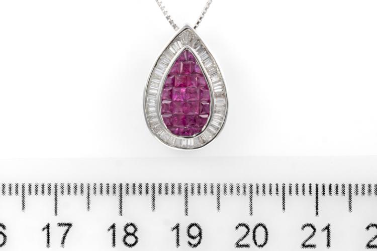 Ruby and Diamond Pendant with carre cut Natural Rubies totalling 1.50cts and Natural Diamonds totalling 0.65cts (Estimated grading: G VS-SI). 18ct white gold with 18ct white gold adjustable 44cm chain. Pendant Dimensions: 19.0mm x 13.0mm. Weight: 4.8g. (Pre-owned)