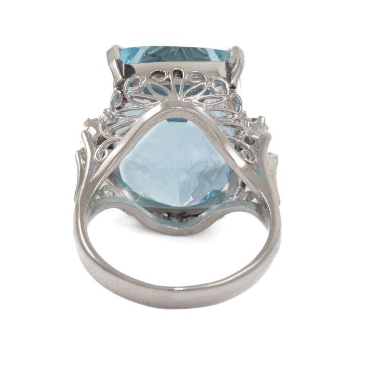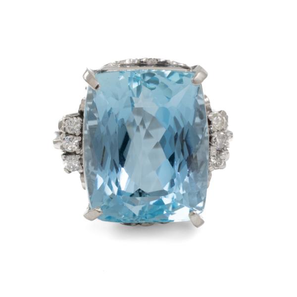 Aquamarine and Diamond ring with cushion cut natural Aquamarine of 15.40ct and round natural Diamonds totalling 0.12ct. Platinum 900. Ring size K. Band width: 2.5mm - 3.7mm. Weight: 10.3g. With Certificate #418760. (Pre-owned)