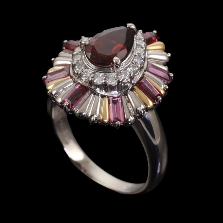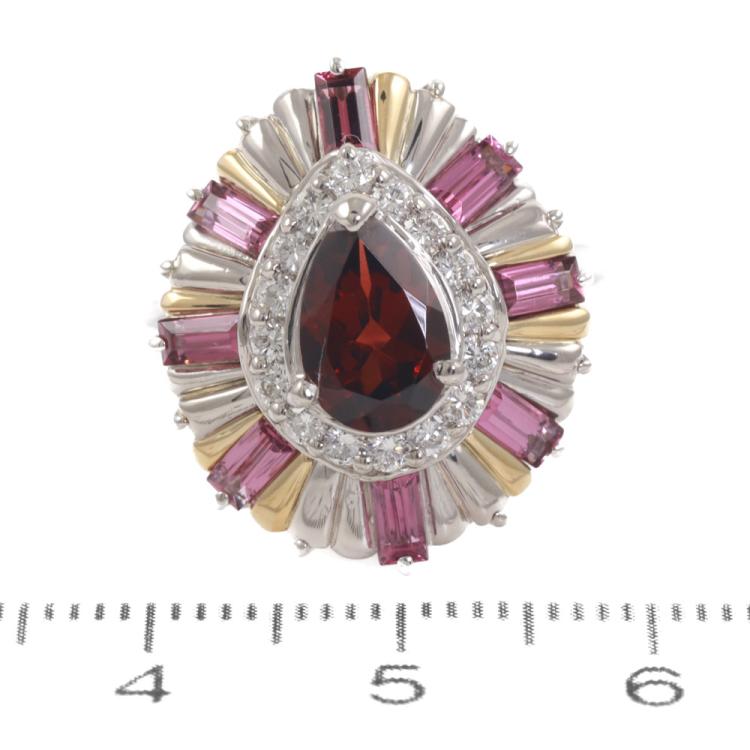 Garnet, Tourmaline and Diamond ring with a pear shape Natural Rhodolite Garnet of 1.55ct, baguette cut Natural pink Tourmaline of 1.11ct and baguette cut Natural Diamonds totalling 0.35ct (Estimated grading: G VS). Platinum 900 and 18ct yellow gold. Ring size O. Band width: 2.5mm - 4mm. Weight: 15.5g. (Pre-owned)