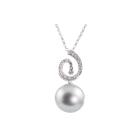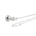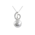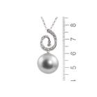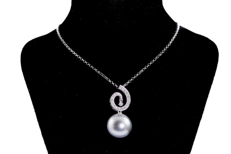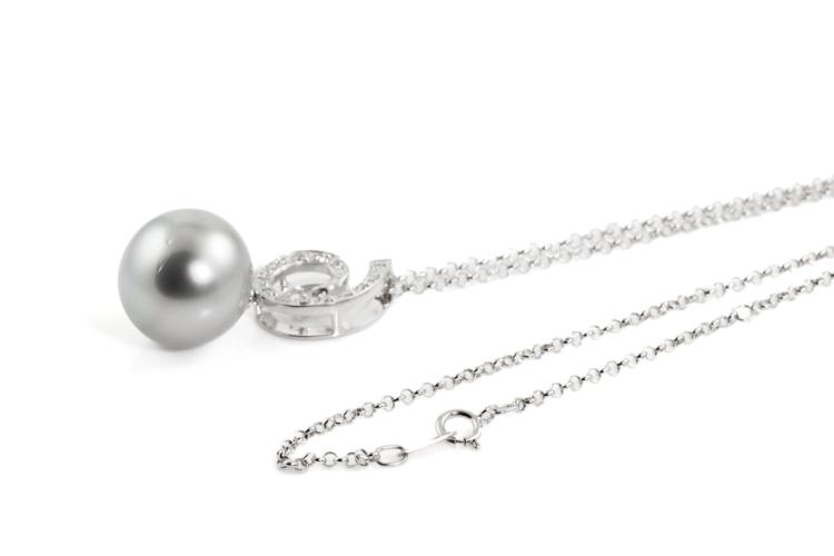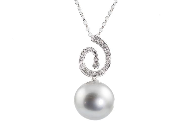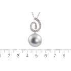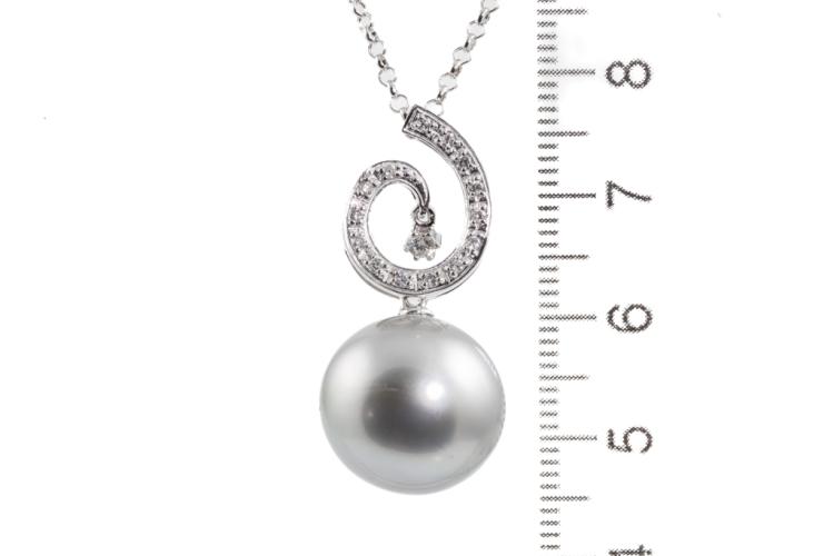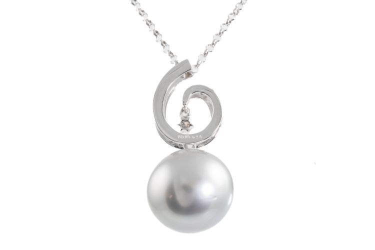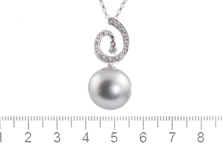 Pearl and Diamond pendant with silver tone, Tahitian Pearl of 15mm and Natural Diamonds totalling 0.16ct. 18ct white gold with 38cm 18ct white gold chain. Weight: 8.5g. (Pre-owned)
