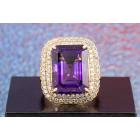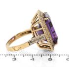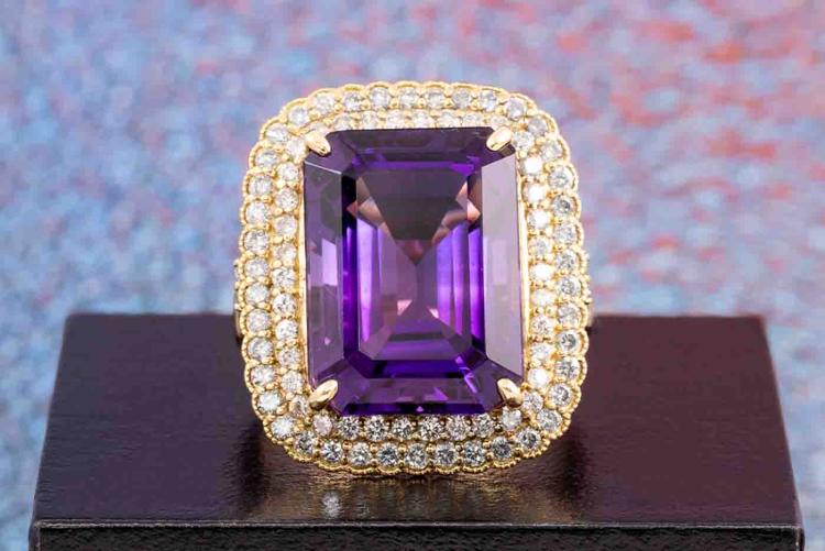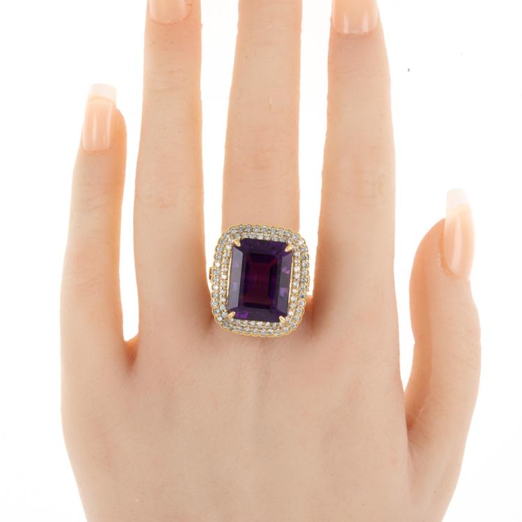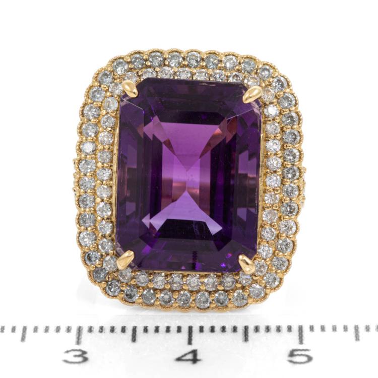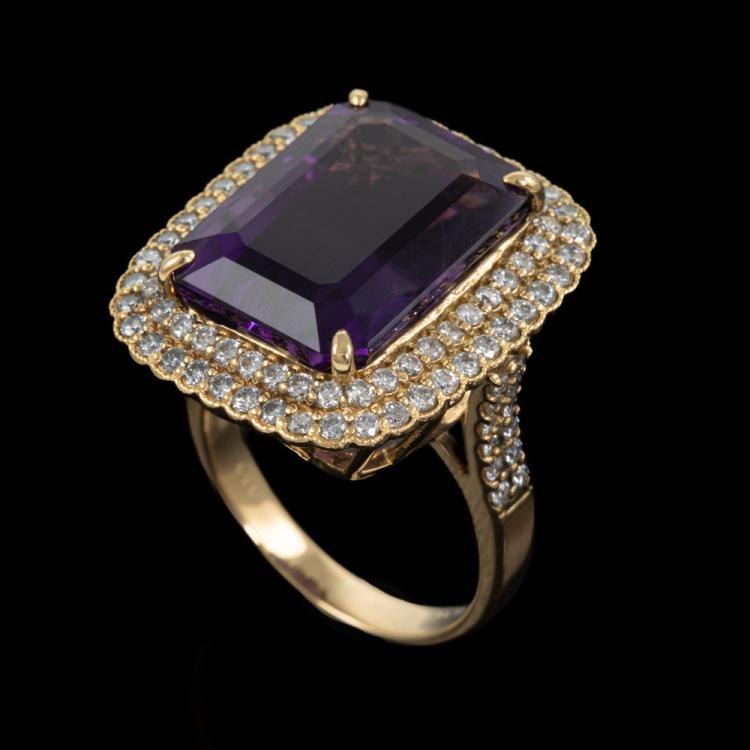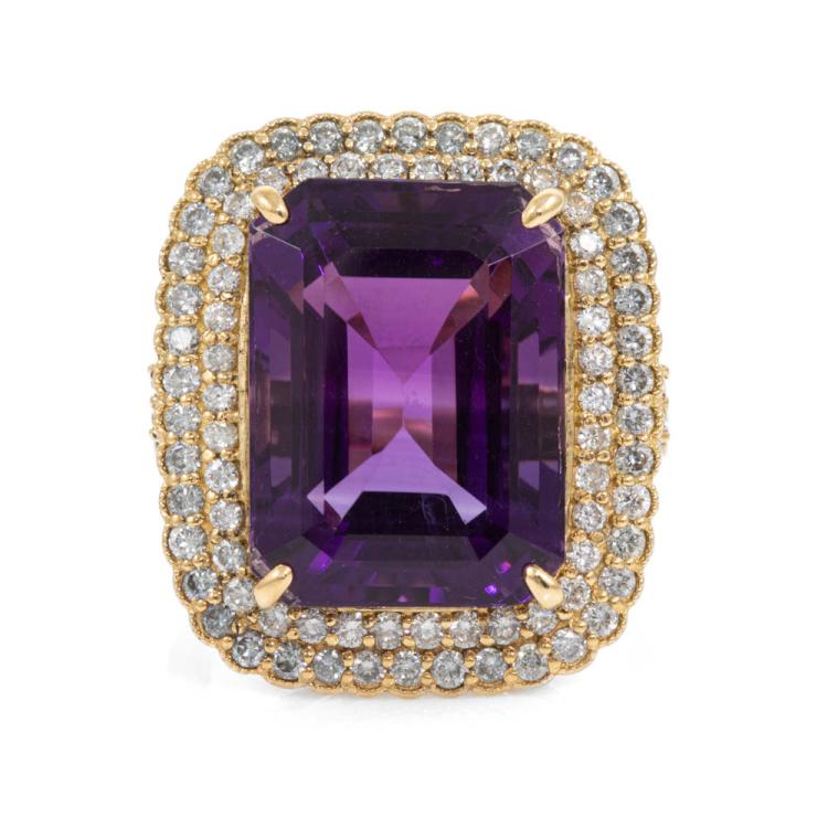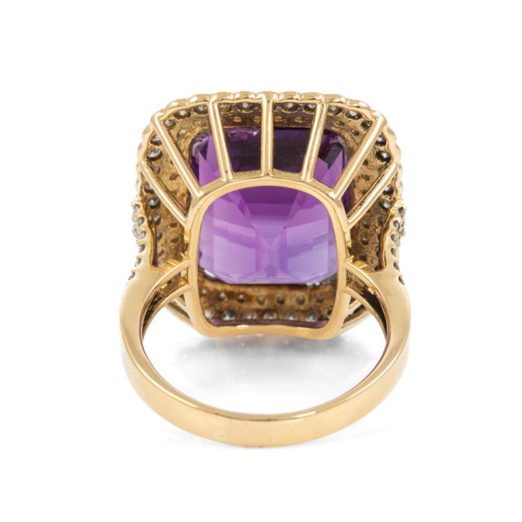 Amethyst and Diamond ring with emerald cut natural Amethyst (17.5 x 12.9mm) of 16.95ct and round natural Diamonds totalling 1.51cts (Estimated grading: H-I P1). 18ct yellow gold. Ring size Q1/2. Band width: 3.0mm -3.30mm. Weight: 12.0g. (Pre-owned)