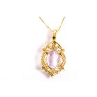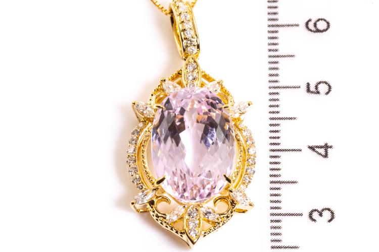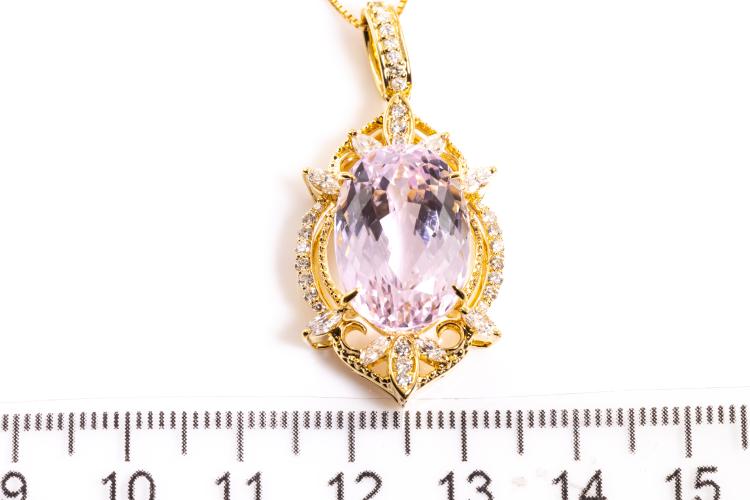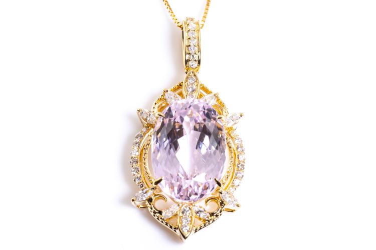 Kunzite and Diamond pendant with oval facetted cut Natural Kunzite of 17.13ct and round and marquise Natural Diamonds totalling 0.75ct (Estimated grading: G-H SI-P1). 18ct yellow gold and 18ct yellow gold adjustable 44cm chain. Weight: 11.0g. (Pre-owned)